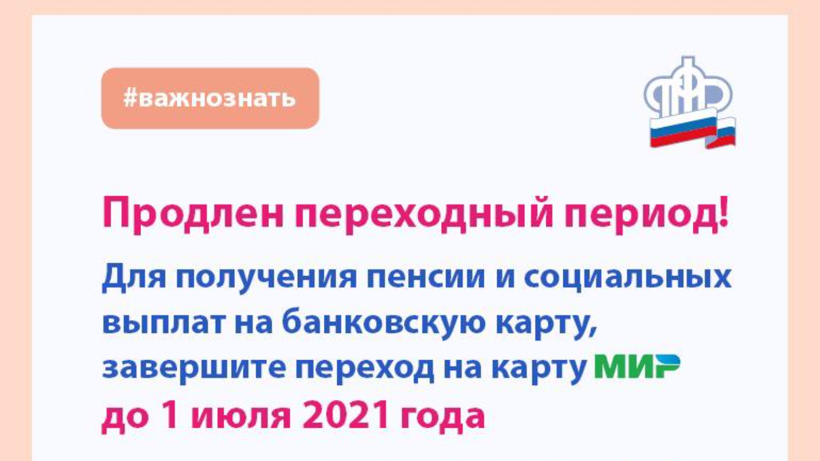 Клиентская служба в Мензелинском районе напоминает, что срок обязательного зачисления пенсий и иных социальных выплат на карты национальной платежной системы «Мир» был продлен Банком России до 1 июля 2021 года. Ранее срок продлевался дважды, в последний раз – до 1 января 2021 года.