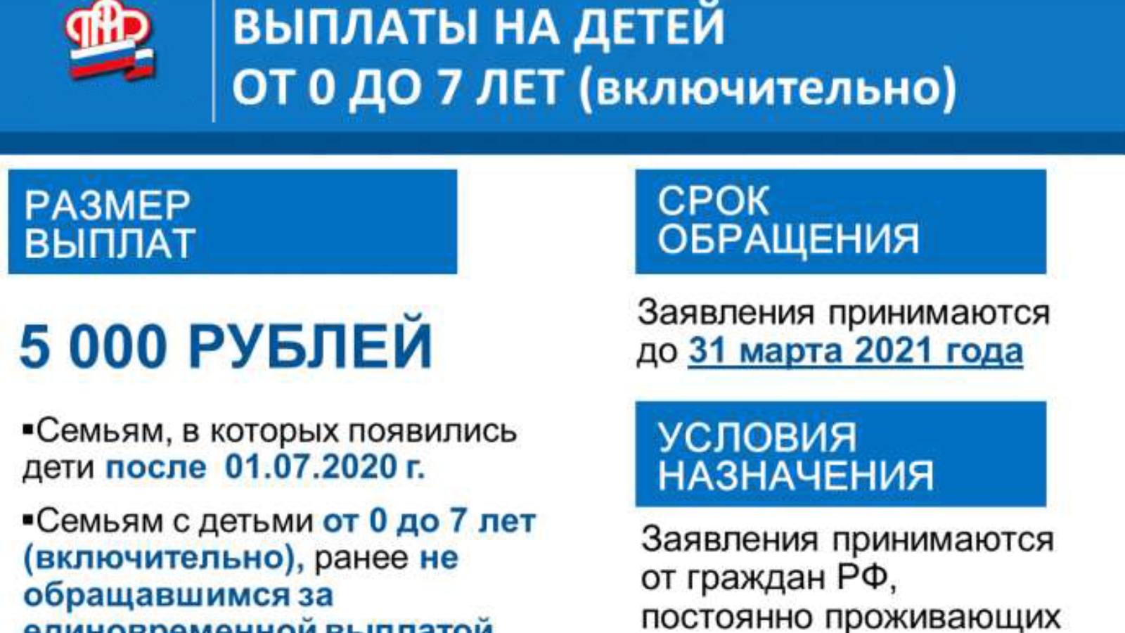 Клиентская служба ПФР Мензелинского района напоминает, что 1 апреля заканчивается срок подачи заявлений на выплаты в размере 5 тысяч рублей семьям с детьми до 8 лет по указу Президента РФ В.В. Путина от 17 декабря 2020 года.