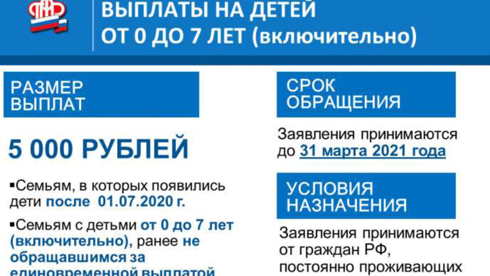 - Указом Президента Российской Федерации от 17.12.2020 No 797 «О единовременной выплате семьям, имеющим детей» предусмотрено установление единовременной выплаты в размере 5000 рублей гражданам Российской Федерации, являющимся родителями детей в возрасте до 7 лет включительно, имеющих гражданство Российской Федерации.