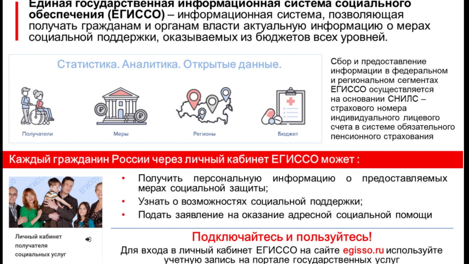 Единая государственная информационная система социального обеспечения (ЕГИССО) является информационной системой, позволяющей получать гражданам и органам власти актуальную информацию о мерах социальной поддержки, оказываемых из бюджетов всех уровней, как в отношении отдельно взятого человека, так и в целом по стране, а также получать сведения, необходимые органам власти для предоставления мер социальной поддержки.