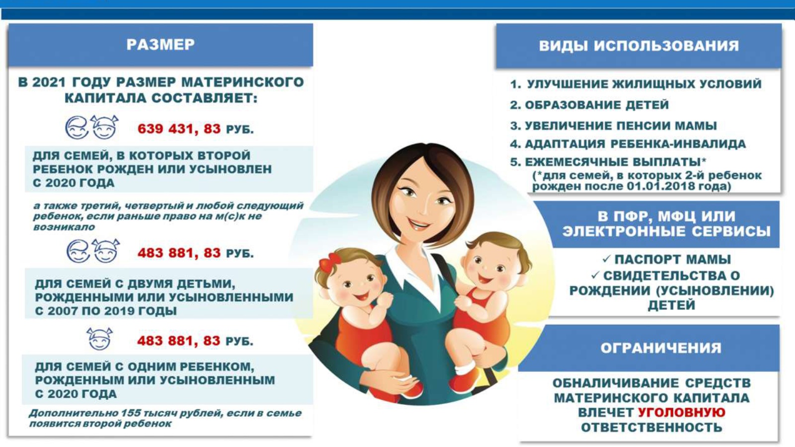 Семьи, в которых начиная с 1 января 2020 года появился первый ребенок, имеют право на материнский капитал в размере 483 881,83 руб. Такая же сумма полагается семьям с детьми, если второй, третий или последующие дети появились до 2020 года, а родители еще не оформили либо не использовали сертификат.