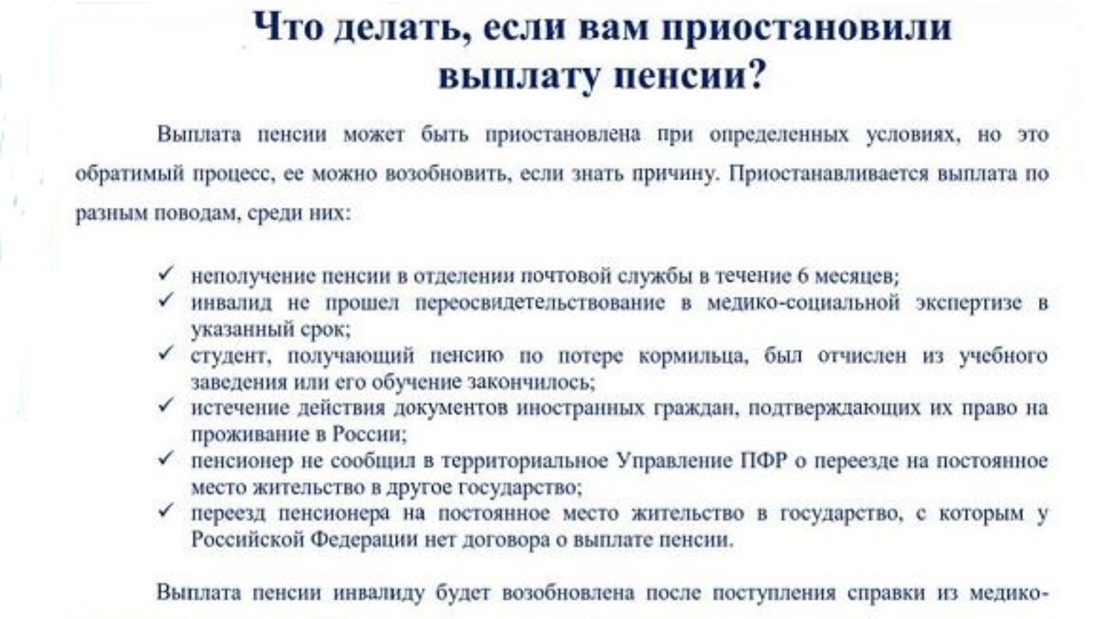 — Уезжал на длительное время в гости к дочери. Вернулся домой спустя полгода. Почтальон в день выплаты пенсии на дом не пришла. В Пенсионном фонде мне сообщили, что выплата пенсии приостановлена. Правомерны ли эти действия?