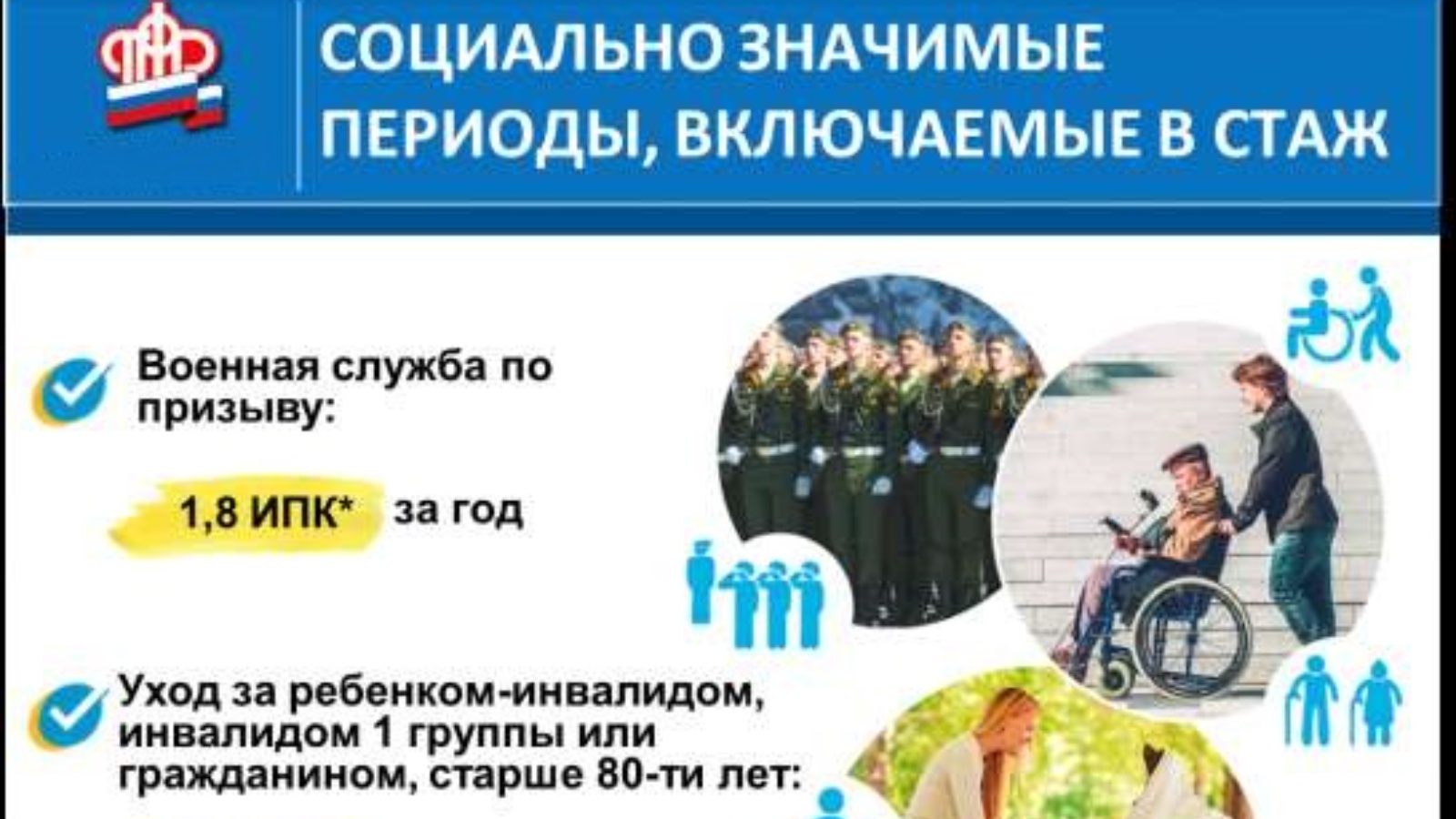 – 1,8 пенсионного коэффициента — период ухода за ребенком-инвалидом, инвалидом I группы;