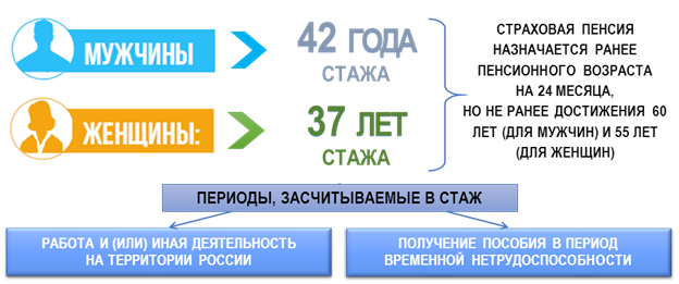 Так, лицам, имеющим страховой стаж не менее 42 лет (для мужчин) и 37 лет (для женщин), страховая пенсия по старости назначается на 2 года ранее общеустановленного пенсионного возраста, но не ранее достижения 60 лет (для мужчин) и 55 лет (для женщин).