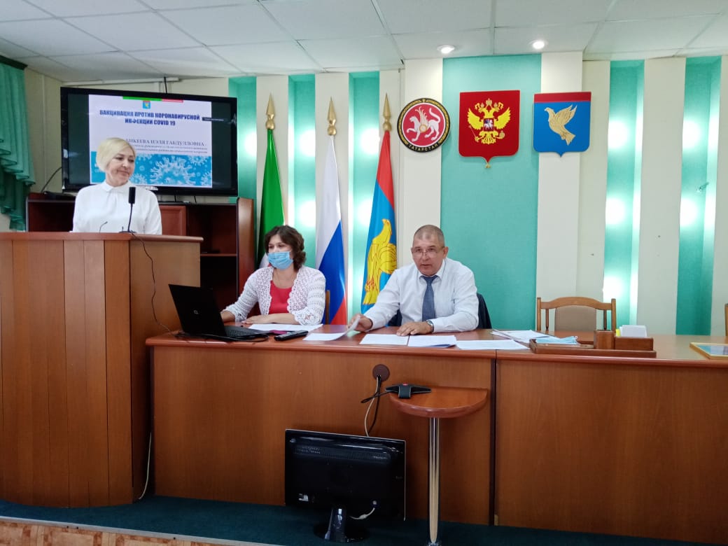 «О выполненной работе по вакцинации населения и соблюдению санитарного режима в общественных местах» - заместитель руководителя Исполнительного комитета района по социальным вопросам Нэля Бикеева;
