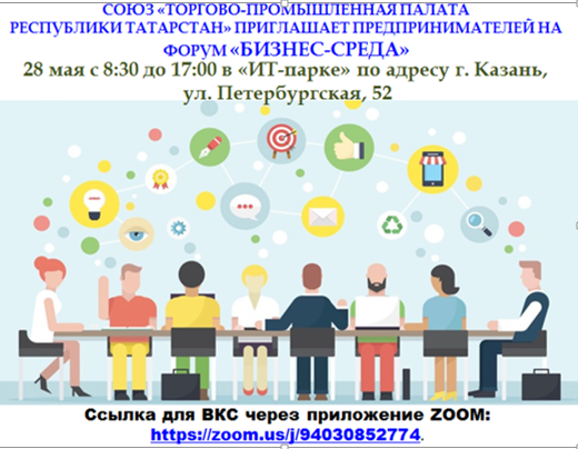 Союз «Торгово-промышленная палата Республики Татарстан» приглашает предпринимателей на форум «БИЗНЕС-СРЕДА», который пройдет 28 мая с 8.30 до 17:00 в «ИТ-парке» г. Казани (IT-park, ул. Петербургская, 52). Регистрация на форум «БИЗНЕС-СРЕДА» обязательна.