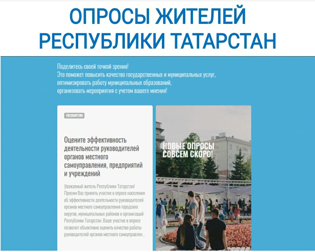 Просим пройти опрос «Эффективность деятельности руководителей органов местного самоуправления, предприятий и учреждений» Ссылка для прохождения опроса: https://open.tatarstan.ru/polls/