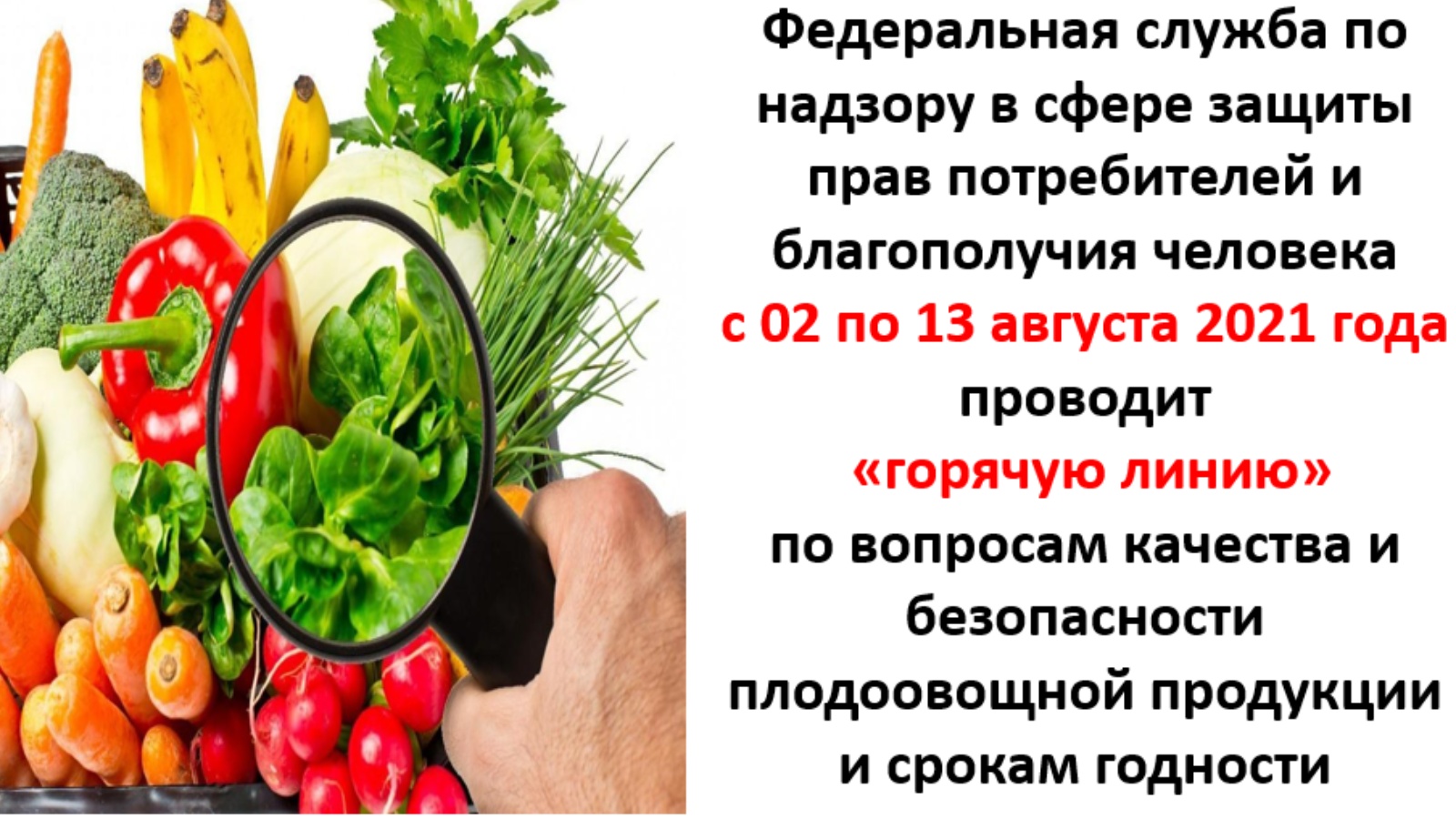 Федеральная служба по надзору в сфере защиты прав потребителей и благополучия человека с 02 по 13 августа 2021 года проводит «горячую линию» по вопросам качества и безопасности плодоовощной продукции и срокам годности.