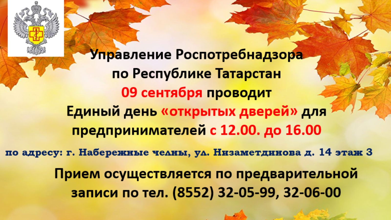 Управление Роспотребнадзора по Республике Татарстан 09 сентября проводит Единый день «открытых дверей» для предпринимателей с 12.00. до 16.00