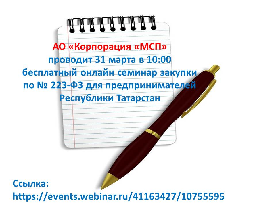 31 марта текущего года в 10:00 АО «Корпорация «МСП» проводит бесплатный обучающий семинар «Участие субъектов МСП и налогоплательщиков налога на профессиональный доход (самозанятых) в закупках отдельных видов юридических лиц по Федеральному закону № 223-ФЗ».