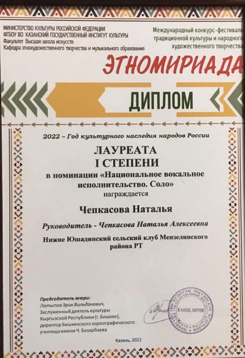 Из Мензелинского района принимали участие в Международном конкурс -фестивале традиционной культуры и народного художественного творчества «Этномириада» Нижне Юшадинский сельский клуб. Лауреатом I степени в номинации «Национальное вокальное исполнительство. Соло» награждена Наталья Чепкасова.