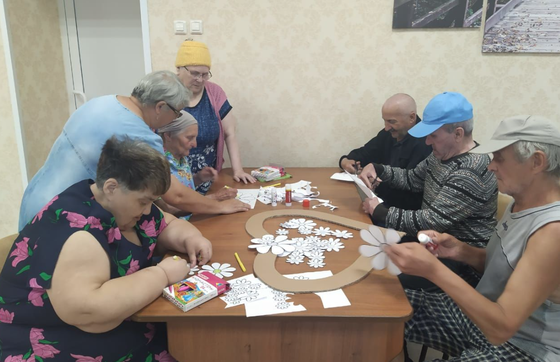 Официальный символ праздника — ромашка. В этот день принято говорить о близких и любимых людях, дарить друг другу добрые слова, улыбаться, радоваться лету и солнцу! Получатели социальных услуг под веселую музыку изготовили фоторамку из ромашек. Этот простенький полевой цветок связан с любовью больше, чем гордые и дорогие орхидеи, розы и другие цветы.