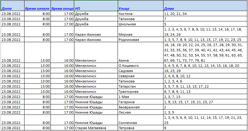 Уважаемые мензелинцы! 23 и 24 августа с 8.00 до 17.00, в связи с ремонтными работами будет отключена электроэнергия по адресам: