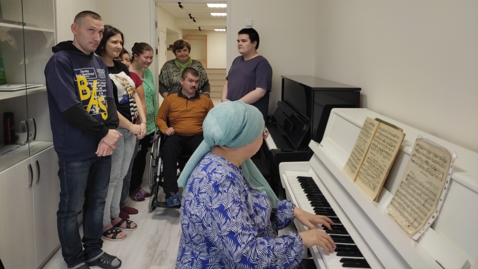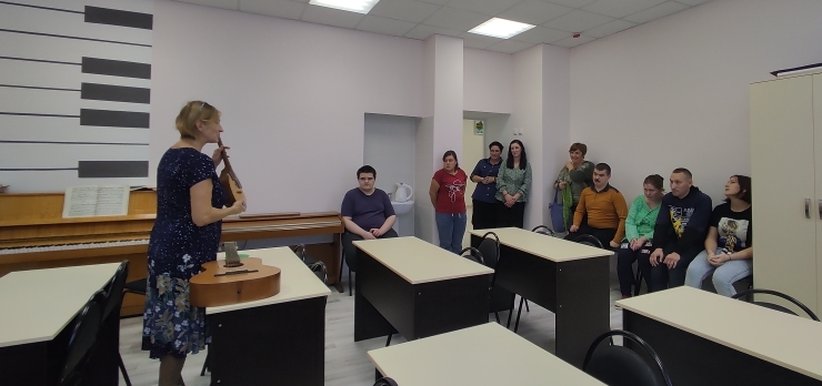 Получателей социальных услуг провели по учебным кабинетам, где преподаватели знакомили и продемонстрировали навыки игры на музыкальных инструментах, такие как: фортепиано, электронное фортепиано, гитара, скрипка, синтезатор, домра.