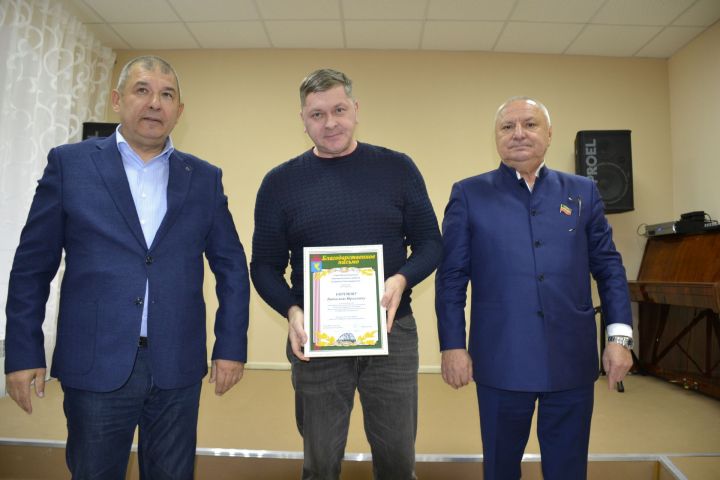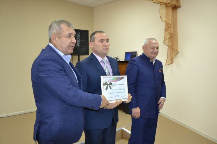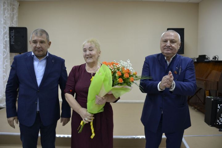 Церемония продолжилась в актовом зале Дома. Глава района Айдар Салахов и Азат Хамаев поздравили ветеранов и членов клубных формирований с новосельем. Азат Киямович вручил сертификат руководителю Дома культурного наследия Рузилю Минниханову, а аккомпаниатору народного хора ветеранов, заслуженному работнику РТ Даниру Фахретдинову – баян в честь 40-летия хора.