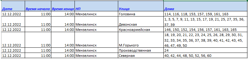 Уважаемые мензелинцы! 12 декабря 2022 года с 11:00 до 14:00 час. в связи с проведением ремонтных работ планируется отключение электроэнергии по адресам: