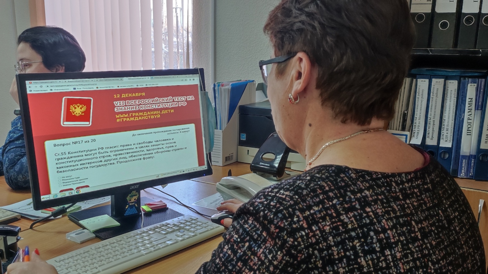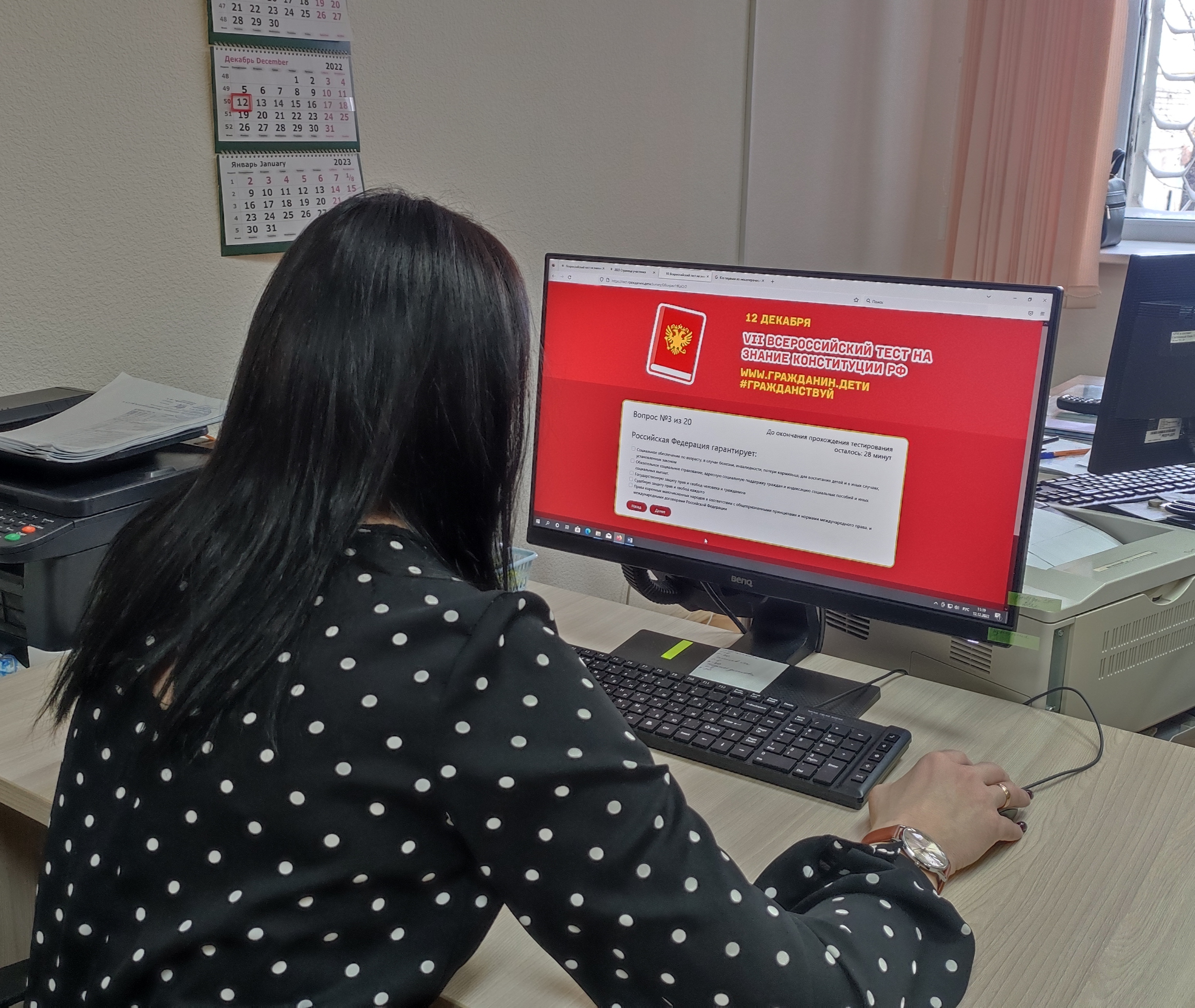12 декабря сотрудники Комплексного центра социального обслуживания населения Мензелинского муниципального района приняли участие во Всероссийском тесте на знание Конституции Российской Федерации. Целью Акции являлось повышение общей правовой грамотности сотрудников учреждения и знания Основного закона России. Участники в количестве сорока одного человека успешно ответили на вопросы теста. Знание гражданских прав и обязанностей показали на высоком уровне.