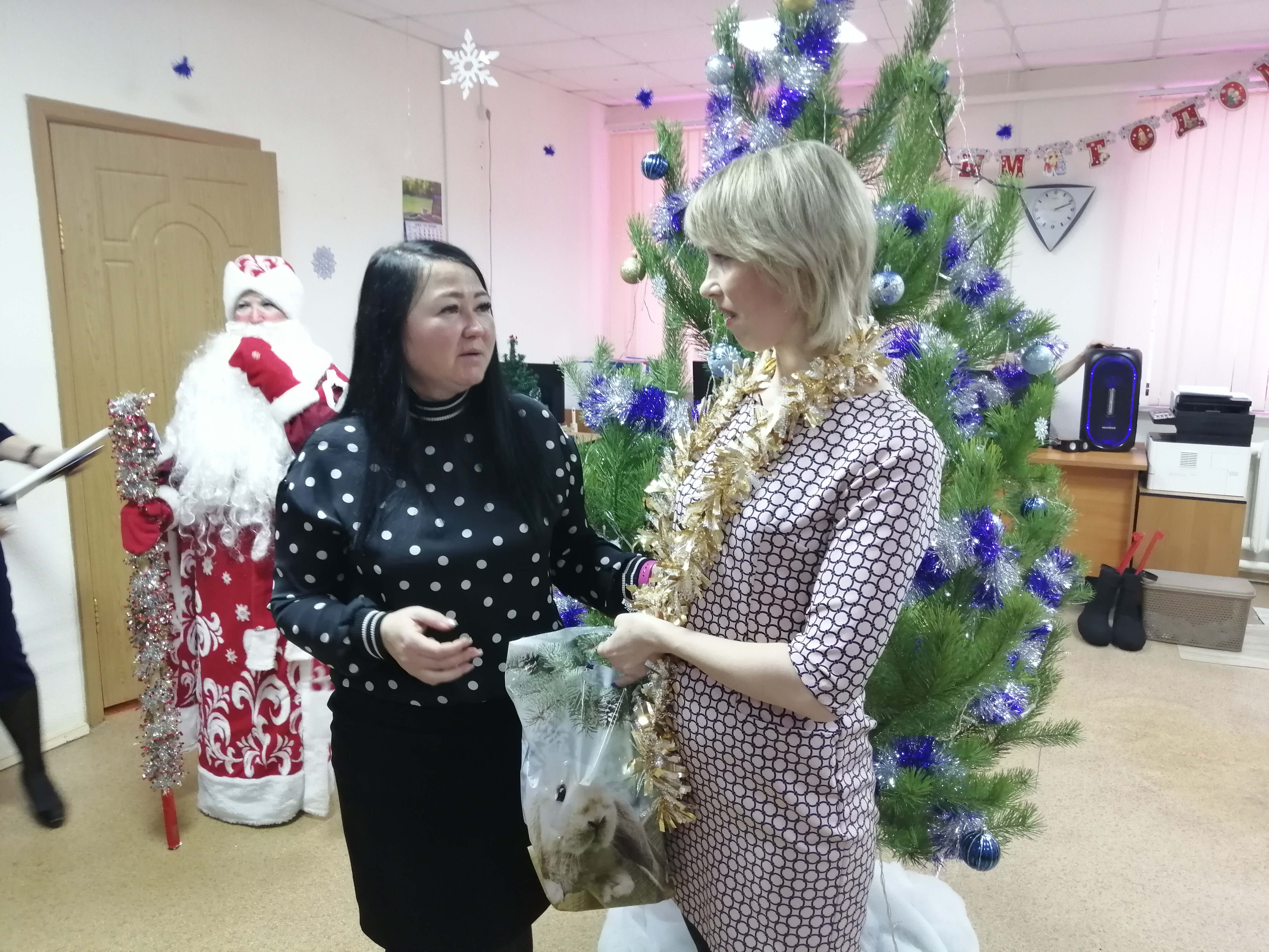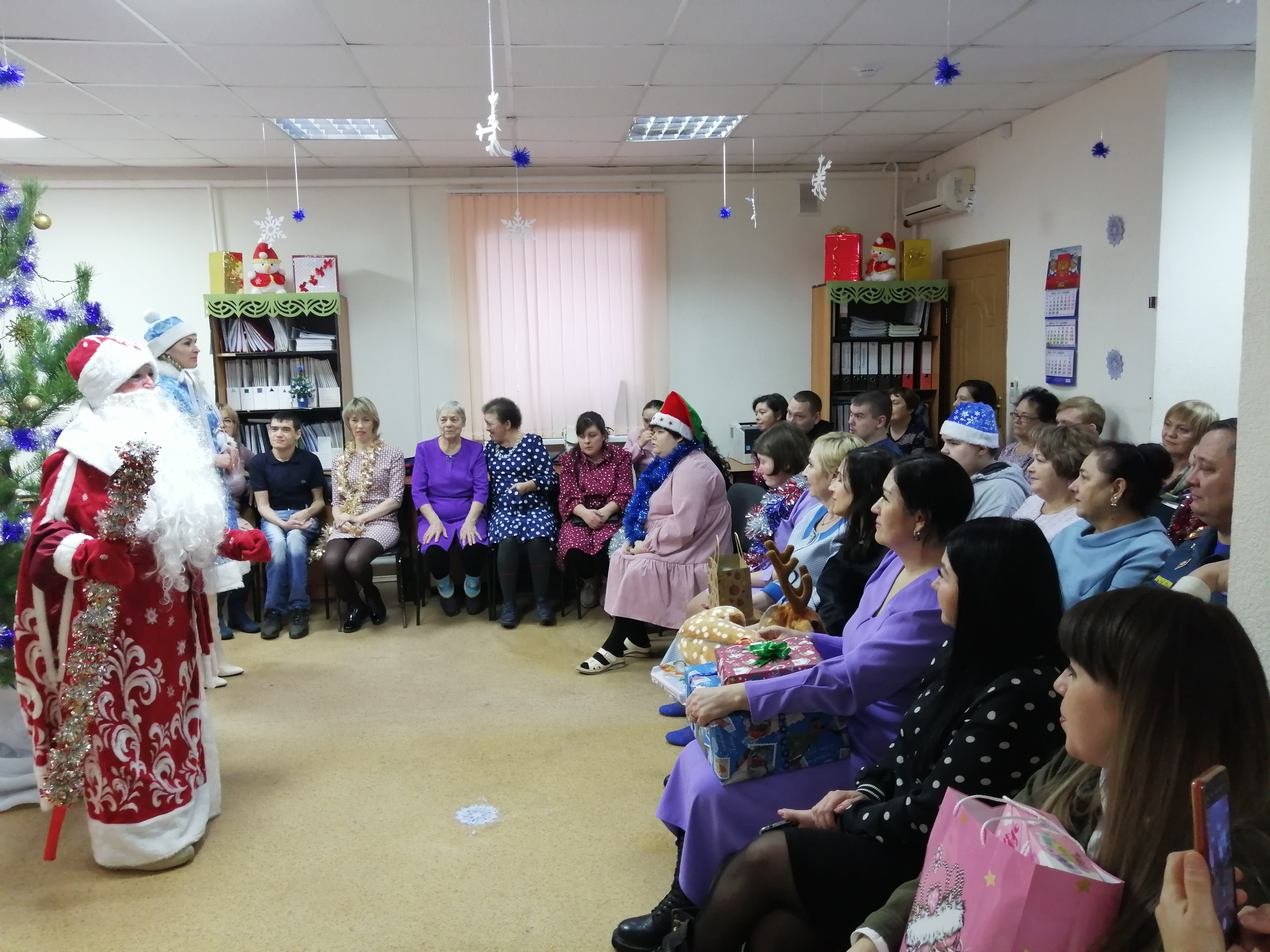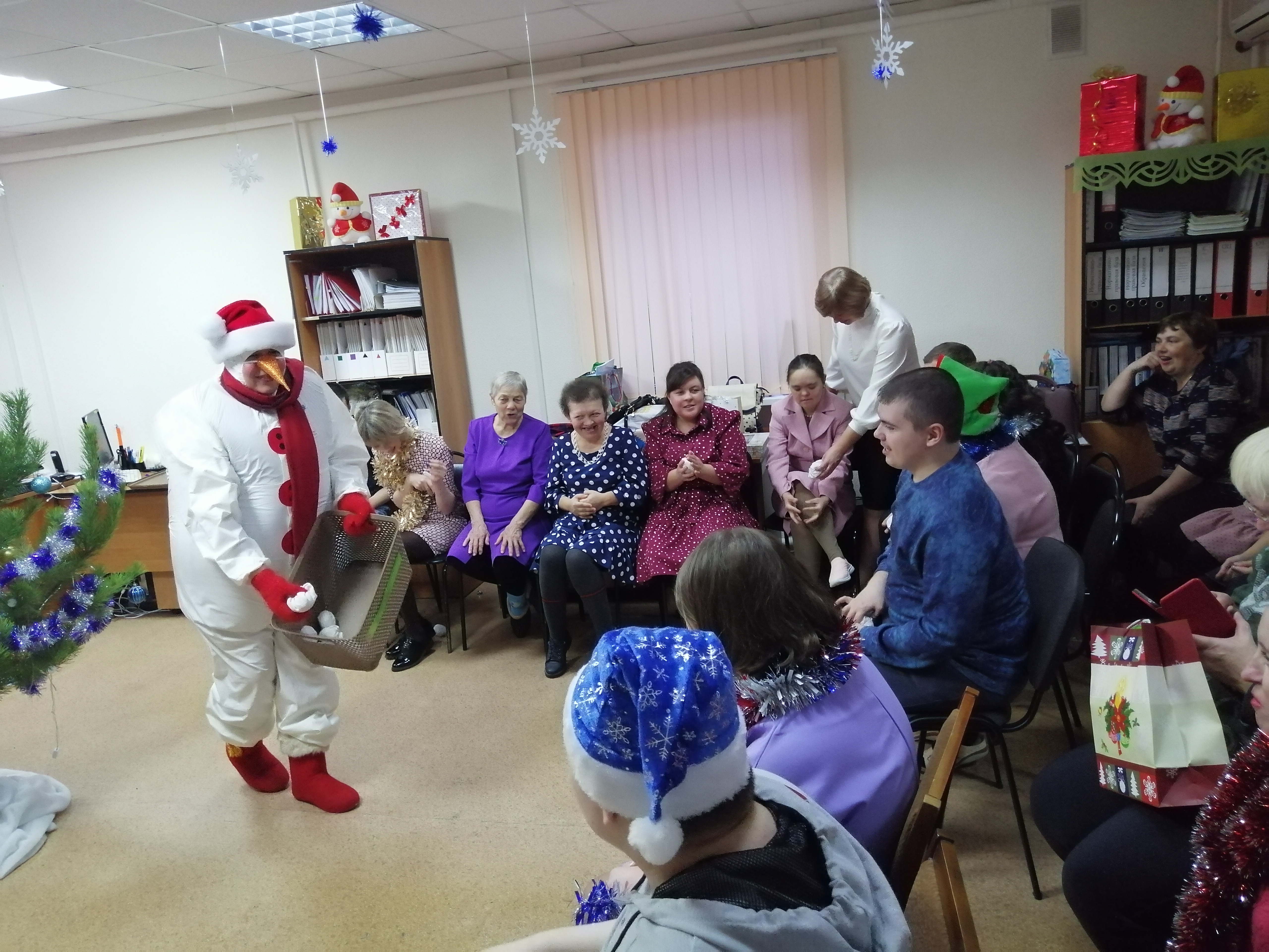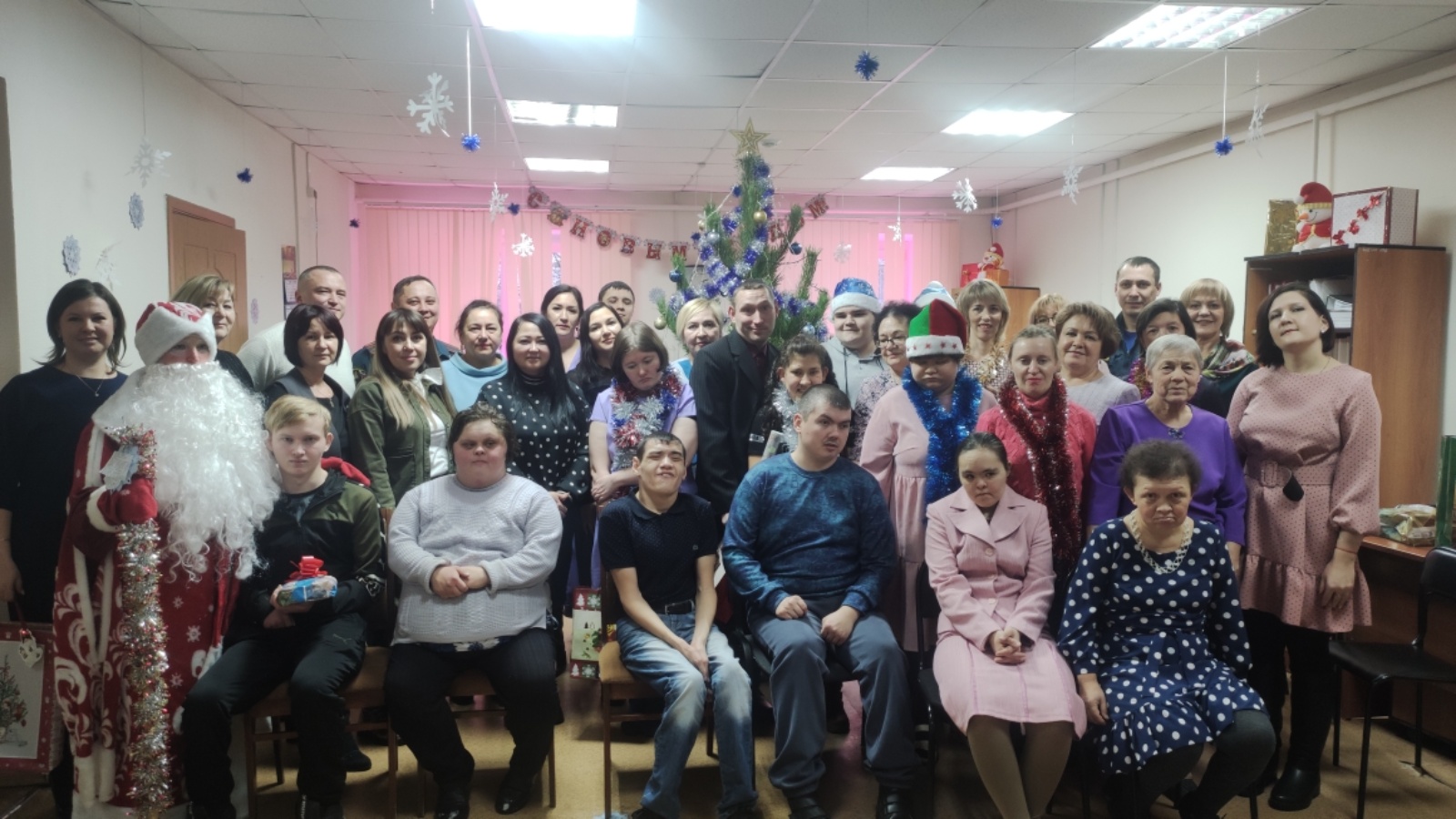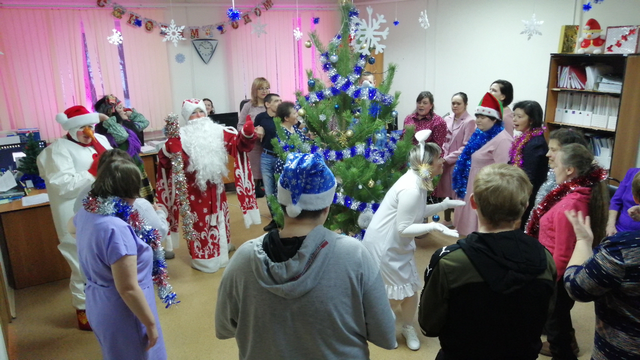 Руководители в роли волшебников и фей, исполнили все их пожелания и вручили подарки нашей неработающей молодежи по причине здоровья, а потом началась сказка. Сказочные герои: Баба-Яга, плюшевый Зайка, веселый Снеговик, Дед Мороз и Снегурочка, увлекли участников в волшебный мир, где они смогли окунуться в праздничную атмосферу приключений, поучаствовать в интересных конкурсах, с вдохновением потанцевать и пообщаться.
