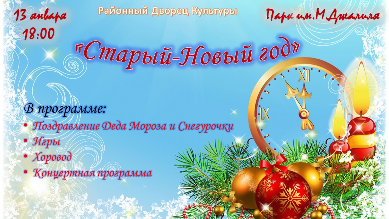 Уважаемые мензелинцы и гости нашего города! Приглашаем вас отметить Старый Новый год вместе с нами в парке им. М.Джалиля.