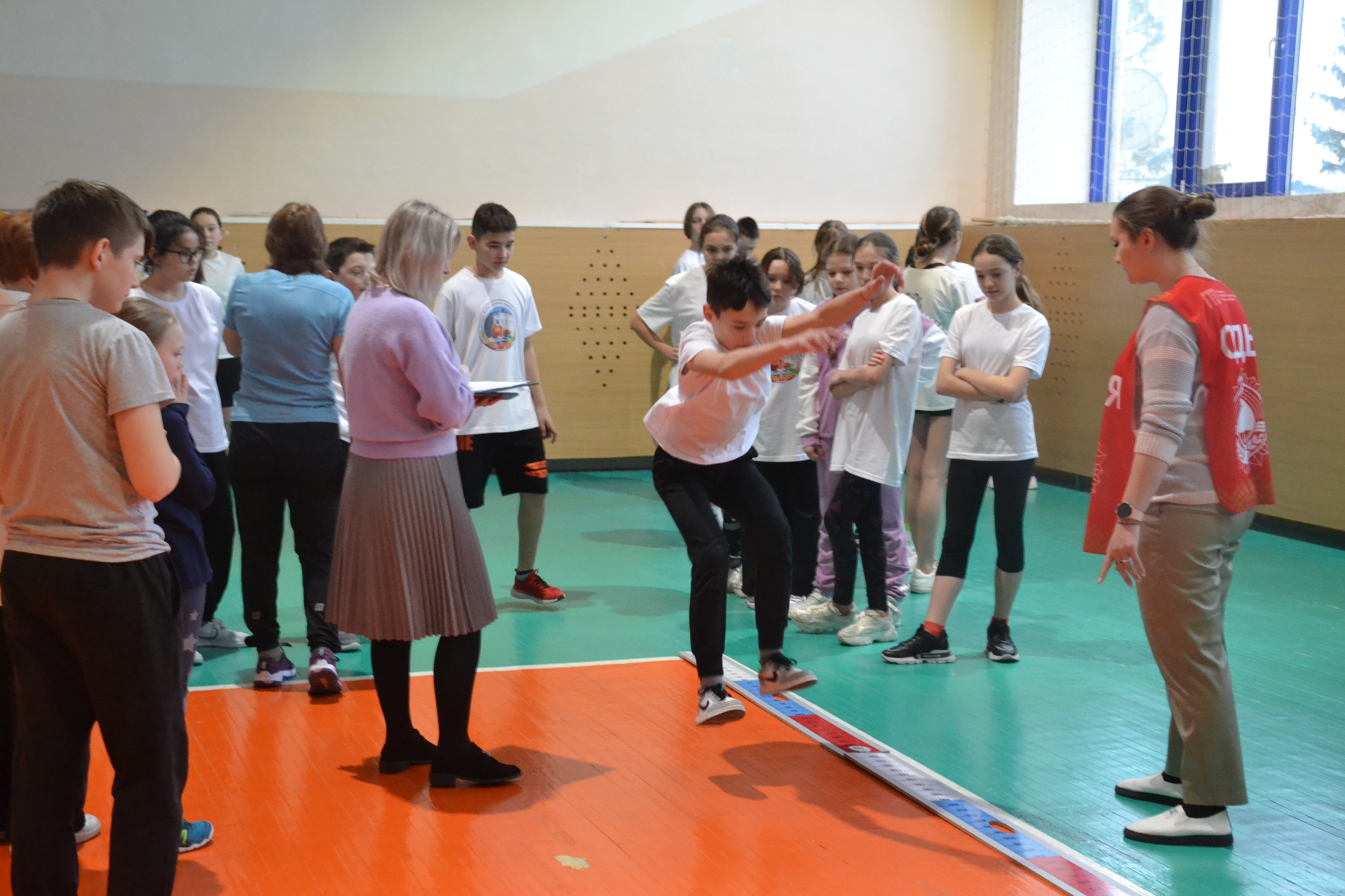 Затем юные спортсмены приступили к сдаче ГТО по отжиманию, подтягиванию, прыжку с места, наклону вперёд.