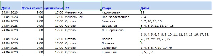 Уважаемые мензелинцы! 24 апреля 2023 года с 09.00 до 17.00 в связи с ремонтными работами будет отключена электроэнергия по адресам: