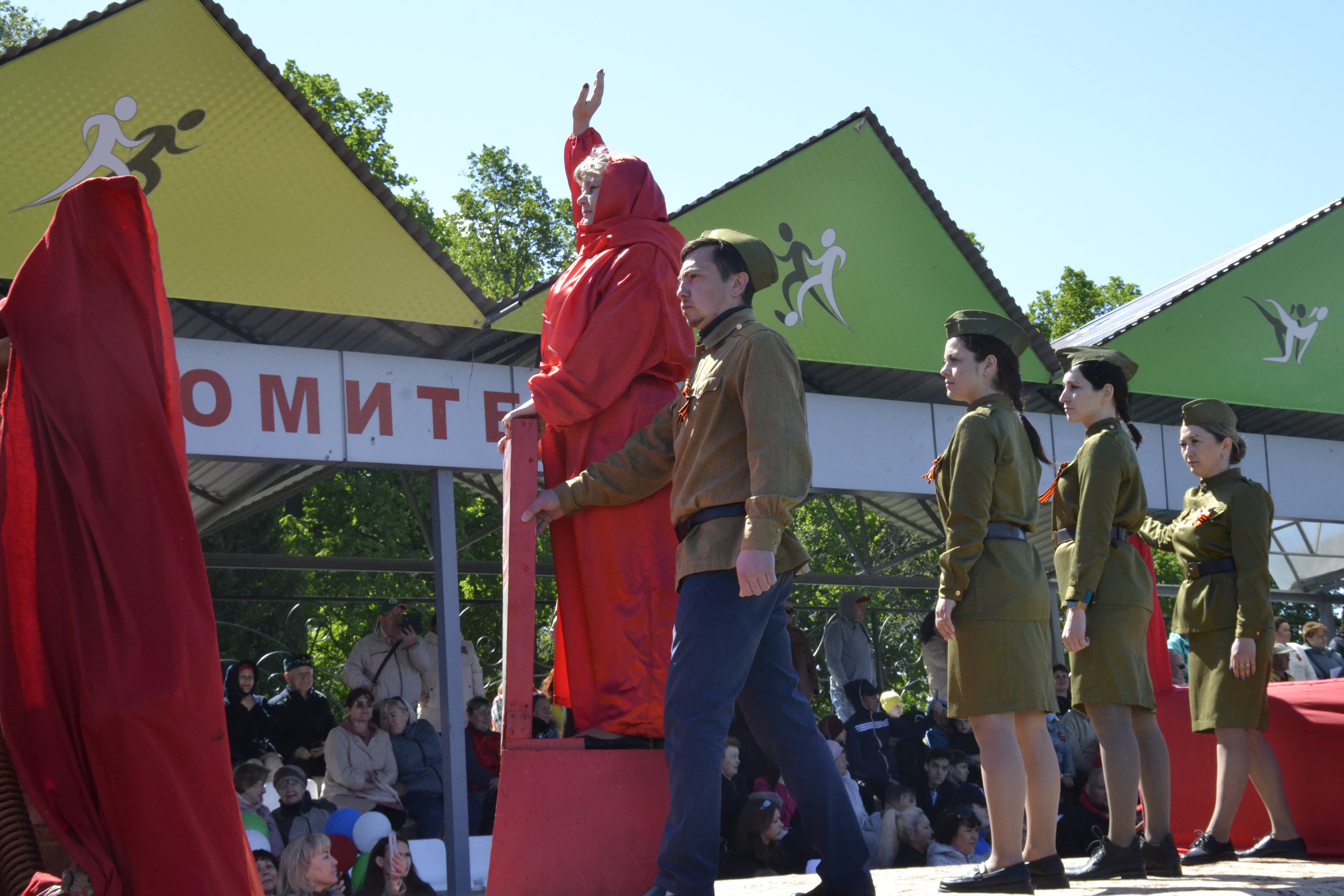 Затем началась театральная композиция. Артисты Мензелинского театра, районного Дворца культуры, учащиеся средних специальных учебных заведений, школ, воспитанники детских садов, девушки отделения аэробики выполнили эти постановки на высоком уровне. Гости праздника с большим интересом посмотрели эти волнительные, переносящие в годы войны выступления.