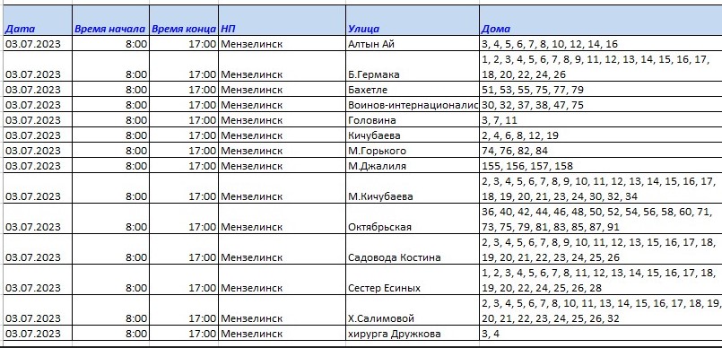 Уважаемые мензелинцы! 03.07.2023 года с 08.00 до 17.00 в связи с ремонтными работами будет отключена электроэнергия по адресам: