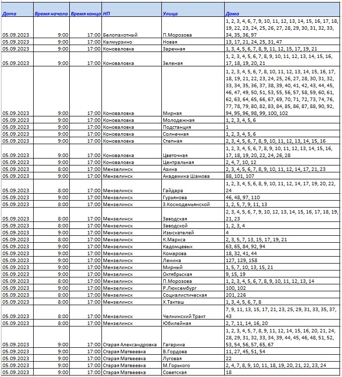 Уважаемые мензелинцы! 05.09.2023 года с 08.00 до 17.00 в связи с ремонтными работами будет отключена электроэнергия по адресам: