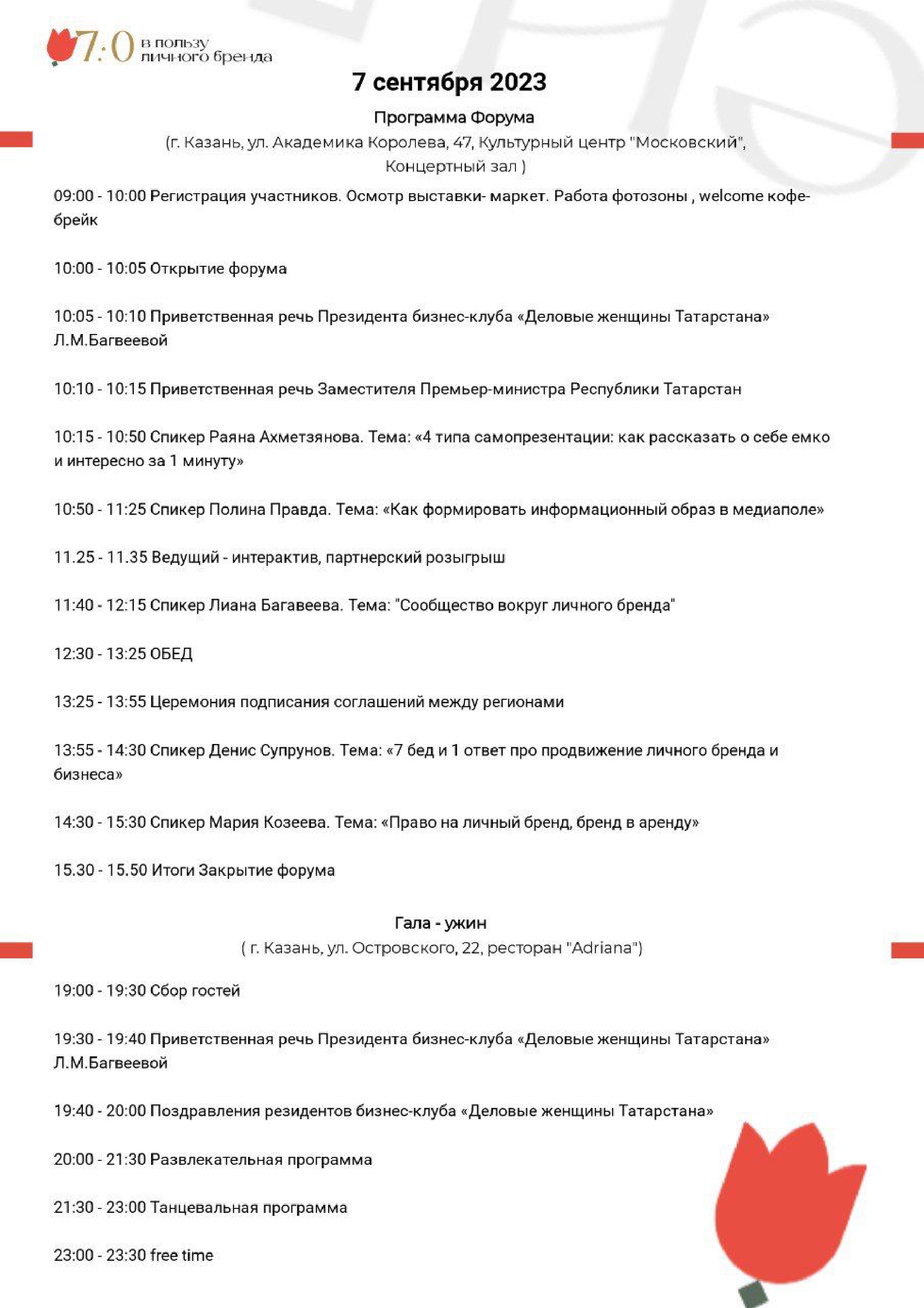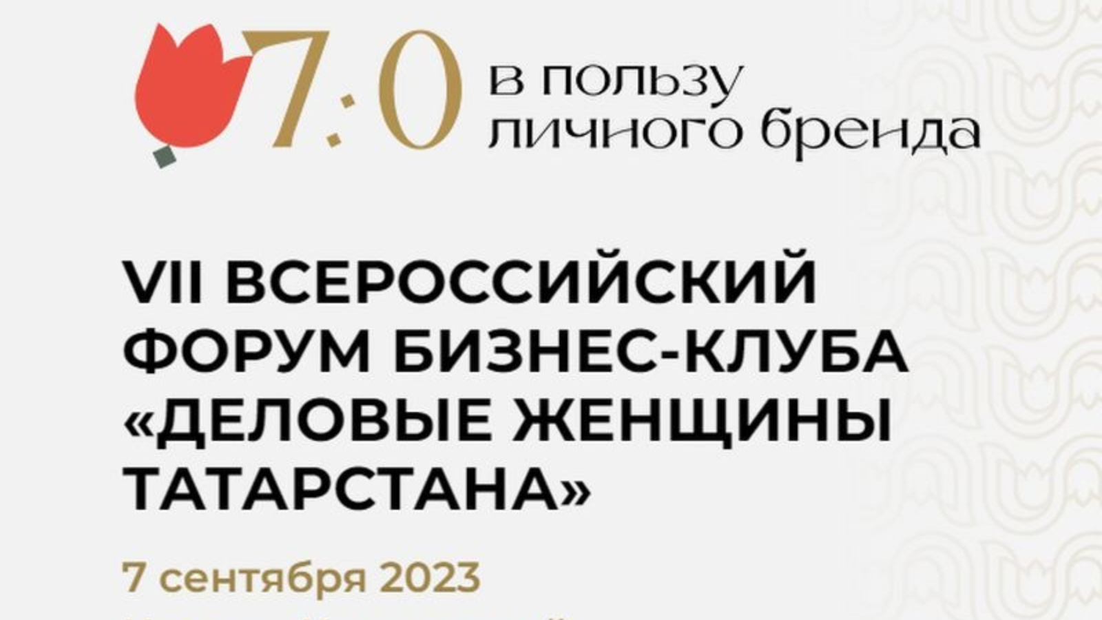 7 сентября 2023 года состоится VII Форум деловых женщин Татарстана. Тема Форума: «7:0 в пользу личного бренда» (далее – Форум), организатором выступает Татарстанская региональная общественная организация «Деловые женщины Татарстана» организованная в 2012 году и являющаяся основанным на членстве добровольным самоуправляемым общественным объединением деловых женщин на основе общности их интересов в развитии предпринимательской, общественной, культурной, образовательной и политической деятельности женщин Республики Татарстан.