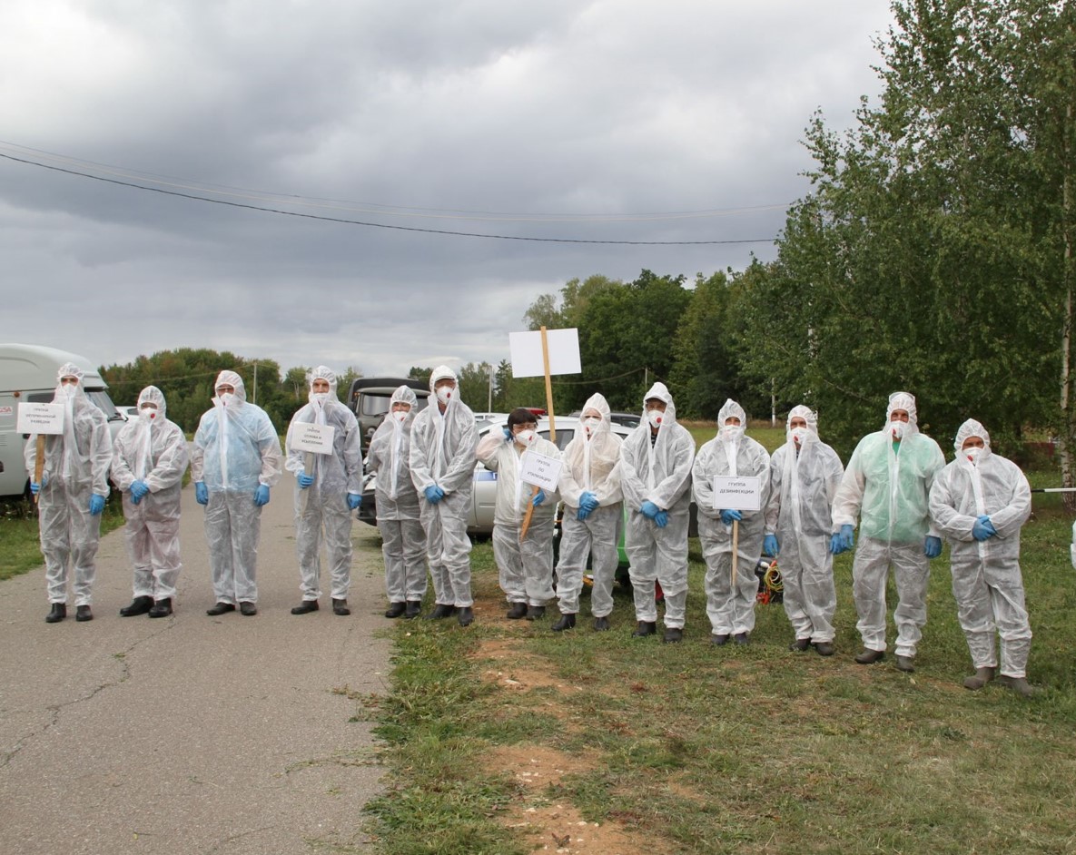 По легенде учений, в личном хозяйстве Петрова в одной из деревень неподалеку от города погибли куры. На место ЧП выезжает группа ветеринарного осмотра и отбора патологического материала (туши мертвой курицы). Эти люди первыми вступают в источник инфекции. У них есть противочумная одежда и средства индивидуальной защиты. Их задача-отбор биоматериалов. Специальным препаратом обработали территорию дома и двора, где произошла гибель домашней птицы. В соответствии с ветеринарными требованиями в месте обнаружения птичьего гриппа объявлен карантин. Также карантин объявили в населенном пункте. Машины, въезжавшие и выезжавшие из села, обрабатывали препаратами.