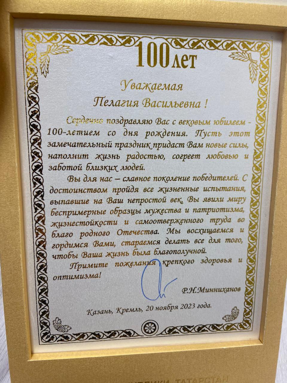 Уважаемая Пелагия Васильевна! Примите искренние поздравления с днём Вашего рождения! Мы гордимся Вашим поколением – поколением героев и победителей, которые с честью прошли через тяжелейшие испытания Великой Отечественной войны. Желаем Вам крепкого здоровья, долголетия, хорошего настроения, внимания родных и близких.