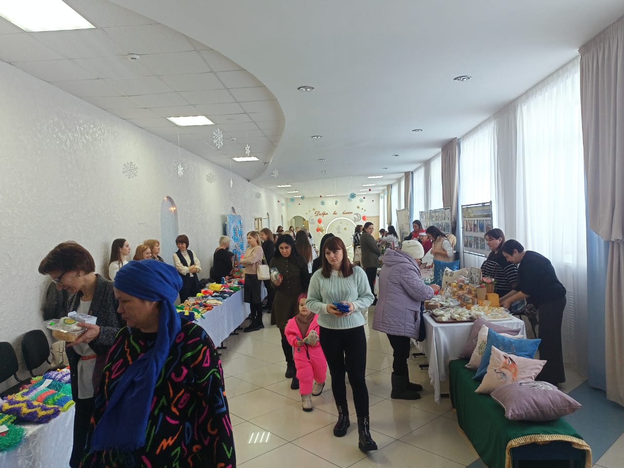 Параллельно с марафоном в фойе районного Дворца культуры проводится благотворительная ярмарка. Коллективы учреждений образования, социальной защиты торгуют сделанными своими руками поделками, сувенирами, выпечкой, а вырученные от продажи деньги также кладут в благотворительный ящик.