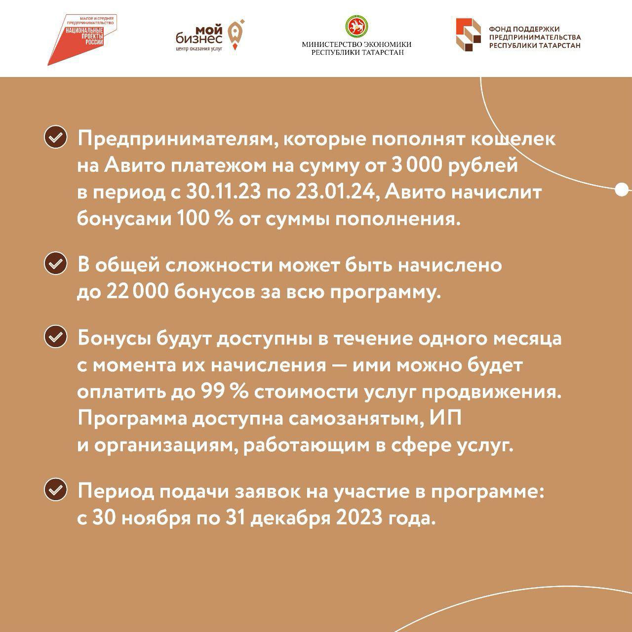начисления – ими можно будет оплатить до 99% стоимости услуг продвижения. Программа доступна самозанятым, ИП и организациям, работающим в сфере услуг.