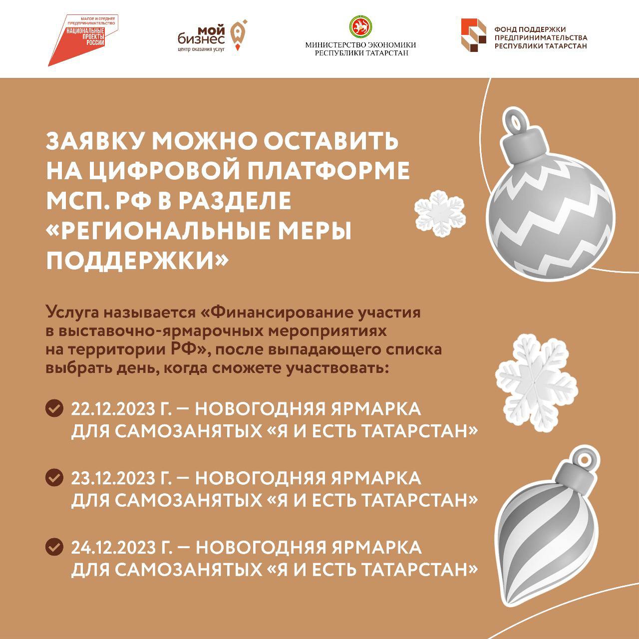 В Татарстане самозанятым предоставят бесплатные торговые места на новогодней ярмарке Центр «Мой бизнес» при поддержке Министерства экономики РТ предоставит самозанятым со всей республики более 200 бесплатных торговых мест в центре Казани. Новогодняя ярмарка ремесленной продукции самозанятых «Я и есть Татарстан» по нацпроекту «Малое и среднее предпринимательство» пройдет с 22 по 24 декабря.