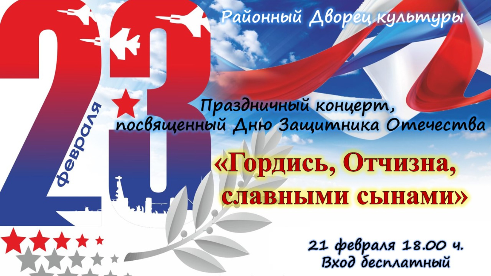 Уважаемые жители и гости нашего района! 21 февраля в 18.00 в Районном Дворце культуры состоится праздничный концерт «Гордись, Отчизна, славными сынами», посвященный Дню защитника Отечества.