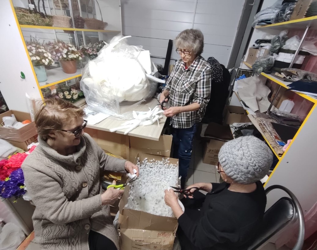 Члены Общественного совета совместно с матерями участников СВО изготавливают для наших земляков маскировочные сети, подушки, шьют трусы, простыни в ТЦ «Донна Роза». Также приносят заготовки, варенья, лапшу и тд.