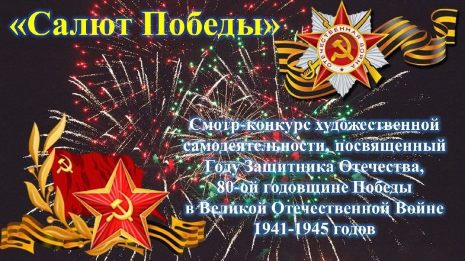 Приглашаем принять участие трудовые коллективы учреждений и организаций района, воспитанников дошкольных учреждений, учащихся общеобразовательных организаций, студентов ССУЗов, работников учреждений культуры принять участие в смотре-конкурсе художественной самодеятельности, посвященном 80-летию Победы и Году защитника Отечества.