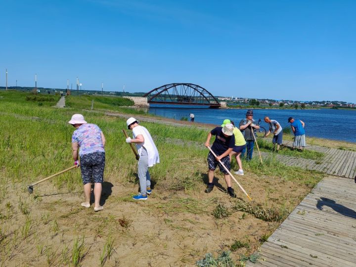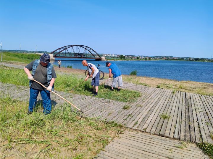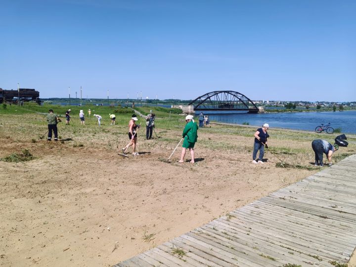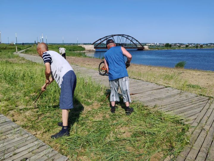 Слаженно работая, они очищают пляж от выросшей травы, скашивая её тримерами и собирая мусор.