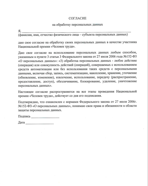 7.2. При подаче Заявки участник Премии в обязательном порядке подтверждает свое согласие на обработку его персональных данных, заполняя прилагаемую к заявке форму согласия на обработку его персональных данных, указанную в Приложении 2 к настоящему Положению. Заявки, направленные без заполненного и подписанного согласия на обработку персональных данных, к рассмотрению приниматься не будут.