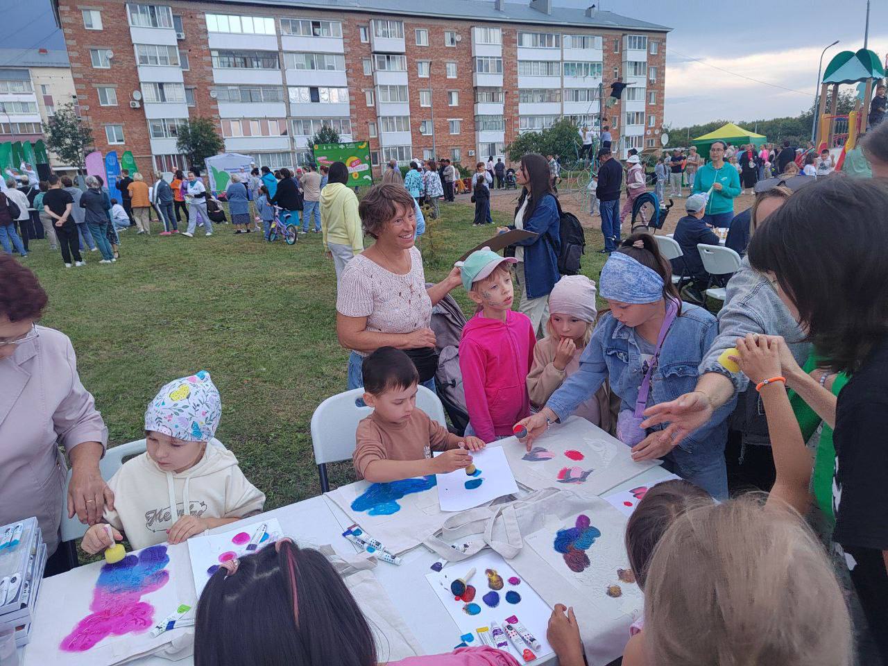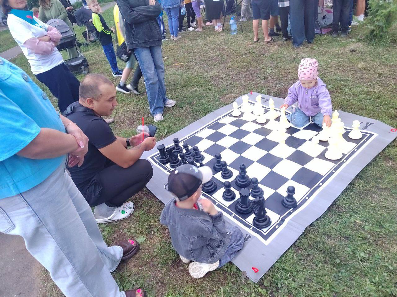 Спортивные площадки привлекли любителей шахмат, шашек и активных игр. Вечером зрители посмотрели мультфильм под открытым небом.