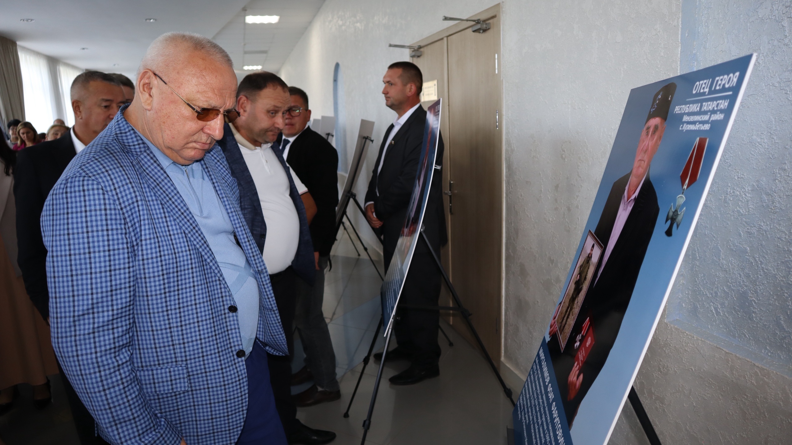 В районном Дворце культуры открылась республиканская передвижная выставка «Отец героя». Экспозиция включает 54 портрета отцов участников СВО, среди которых 8 уроженцев нашего района. На снимках отцы запечатлены с фотографиями сыновей и их боевыми наградами.