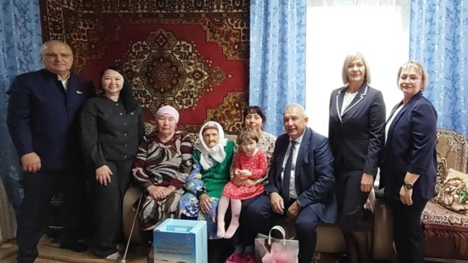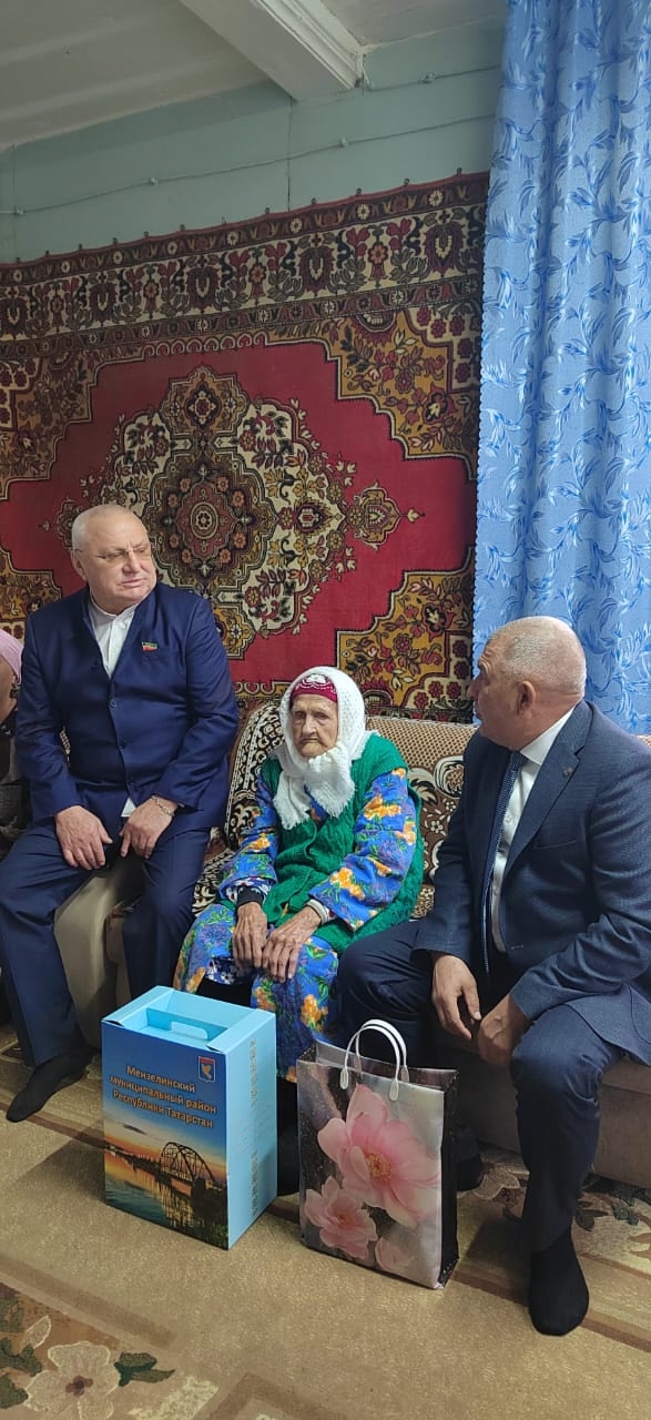 С Днем пожилого человека сегодня поздравили глава района Айдра Фаслахович Салахов с депутатом Государственного Совета Республики Татарстан Азатам Киямовичем Хамаевым долгожительницу нашего района Усманову Мачтуру Мирзаяновну.