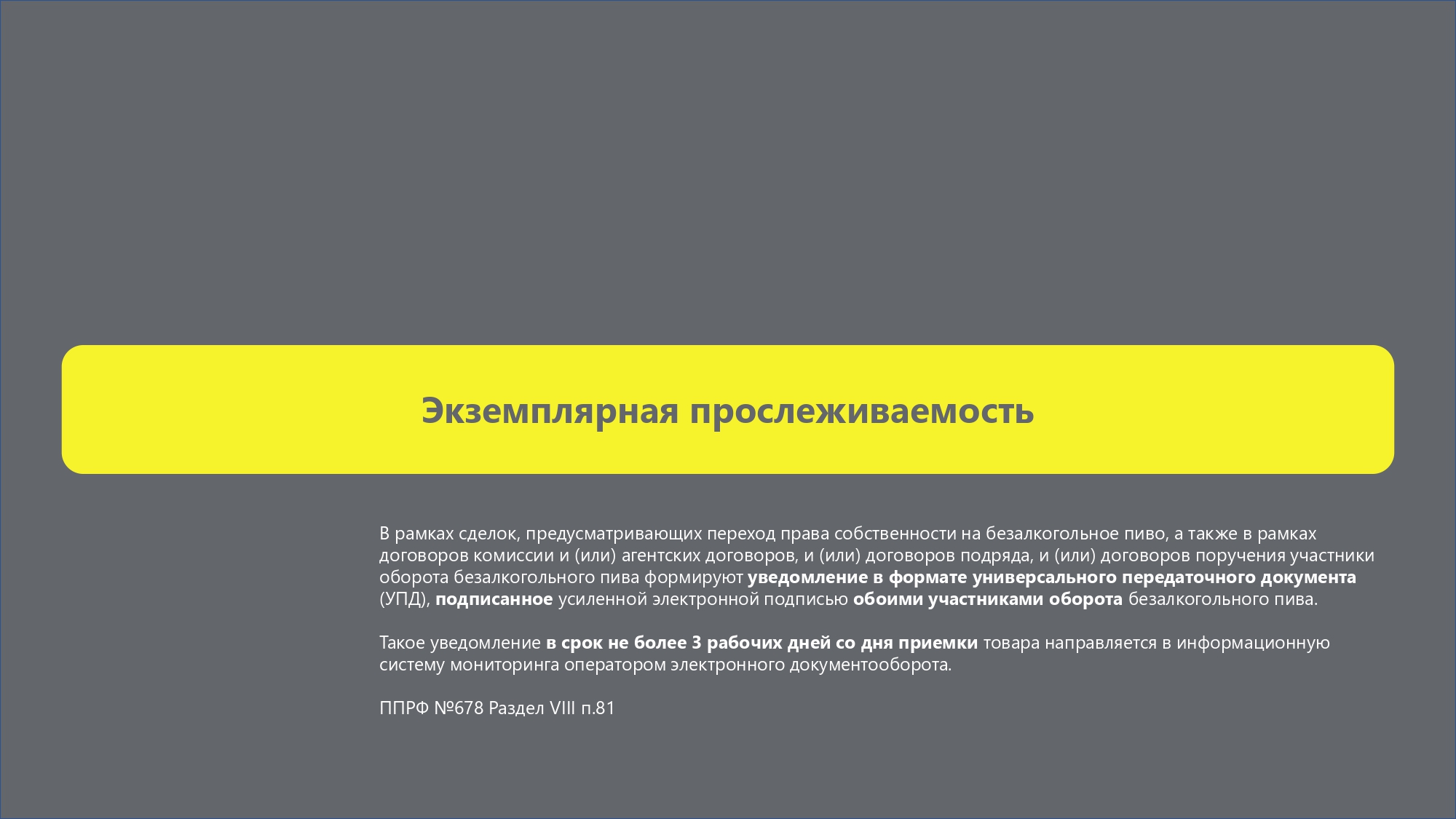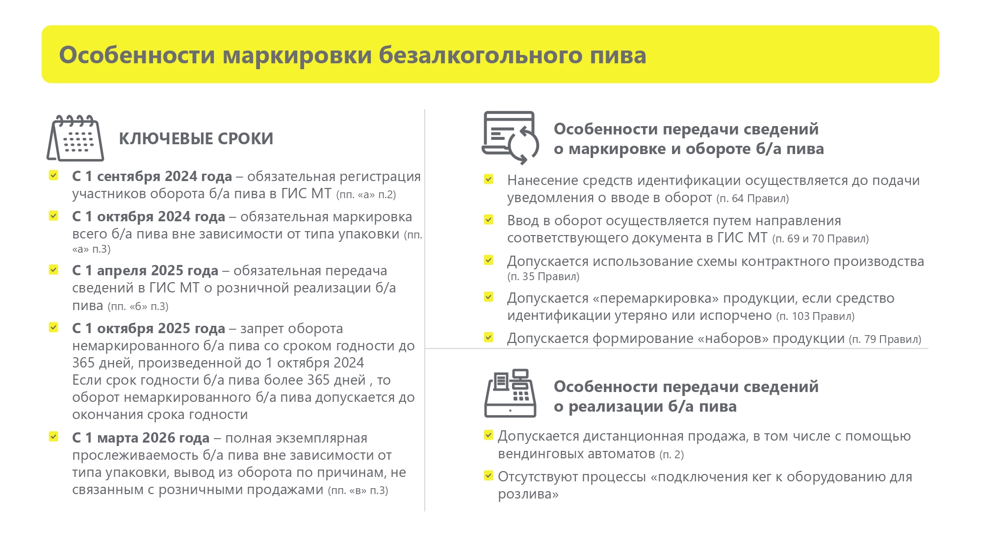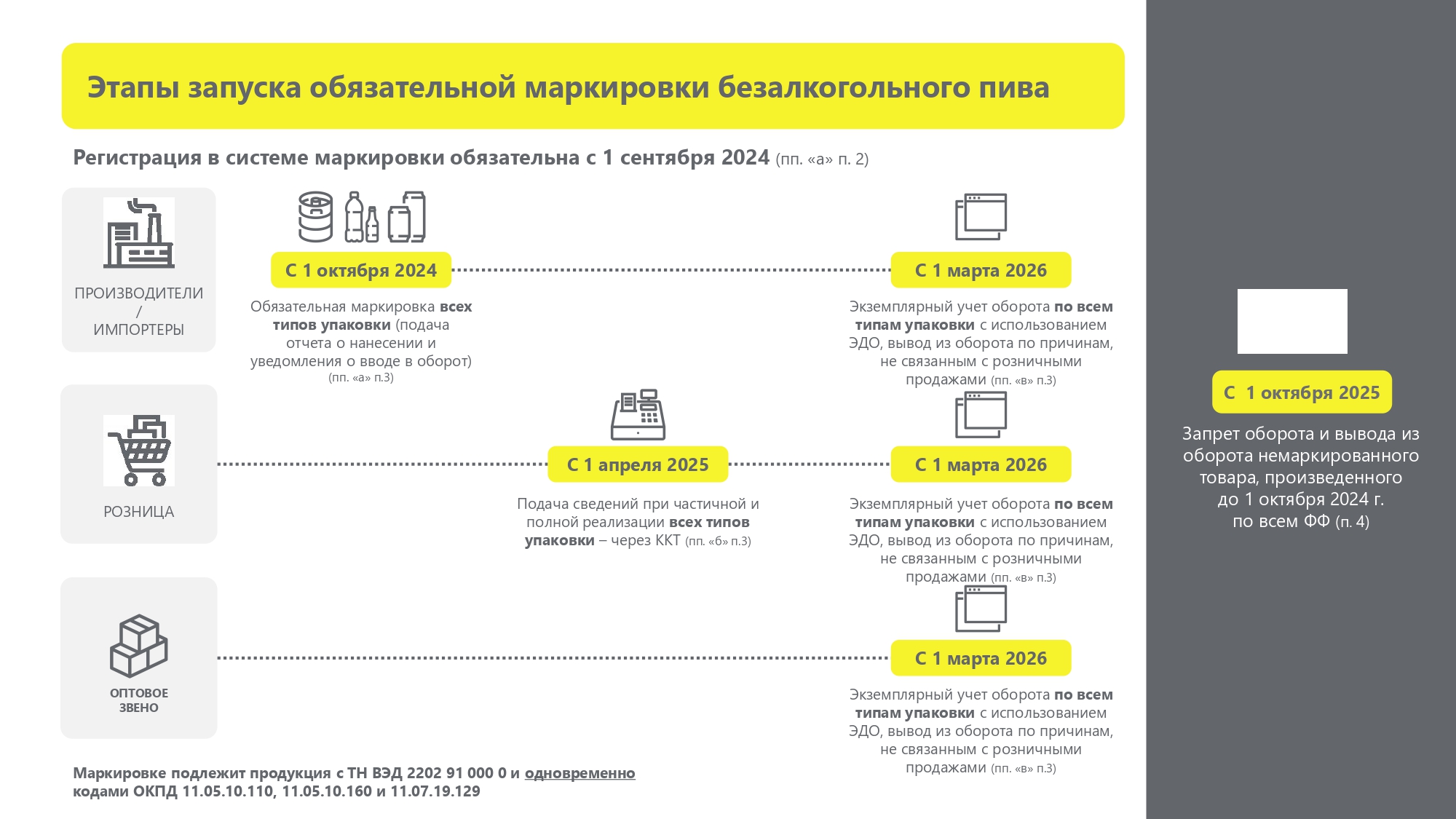 С 01.03.2026 вступают в силу требования постановления Правительства РФ № 678 от 27.05.2024, обязывающие участников оборота безалкогольного пива передавать в систему маркировки сведения об обороте и выводе из оборота (не через розницу) продукции. Необходимо обеспечить информирование бизнеса и разместить материалы о маркировке, включая поэкземплярный учет.