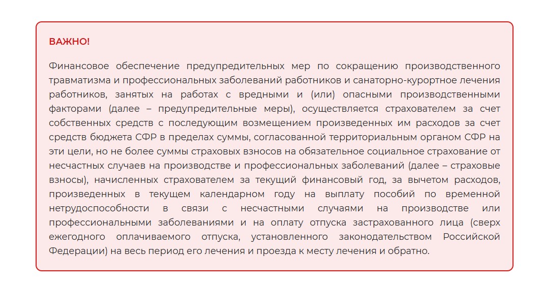 Порядок и условия финансового обеспечения предупредительных мер по сокращению производственного травматизма и профессиональных заболеваний работников определяются Правилами финансового обеспечения предупредительных мер по сокращению производственного травматизма и профессиональных заболеваний работников и санаторно-курортного лечения работников, занятых на работах с вредными и (или) опасными производственными факторами, утвержденными Приказом Минтруда России от 11.07.2024 № 347н (в редакции приказа Минтруда России от 08.08.2025 № 497н). Финансирование обязательных для всех работодателей мероприятий по профилактике производственного травматизма работников страхователь может осуществить за счет средств Фонда пенсионного и социального страхования Российской Федерации (далее - Фонд) в размере до 20 процентов сумм страховых взносов, начисленных им за предшествующий календарный год, за вычетом расходов, произведенных в предшествующем календарном году на выплату пособий по временной нетрудоспособности в связи с несчастными случаями на производстве или профессиональными заболеваниями и на оплату отпуска Социальный фонд России ОТДЕЛЕНИЕ ФОНДА ПЕНСИОННОГО И СОЦИАЛЬНОГО СТРАХОВАНИЯ РОССИЙСКОЙ ФЕДЕРАЦИИ ПО РЕСПУБЛИКЕ ТАТАРСТАН ул. Пушкина, д. 8, Казань, 420111 тел: (843) 279–25–00 факс: (843) 279–26–30 E–mail: tatarstan@16.sfr.gov.ru ОКПО 33872347 ИНН/КПП 1653017530/165501001 Россия Федерациясе Социаль фонды РОССИЯ ФЕДЕРАЦИЯСЕ ПЕНСИЯ ҺӘМ СОЦИАЛЬ ИМИНИЯТ ФОНДЫНЫҢ ТАТАРСТАН РЕСПУБЛИКАСЫ БУЕНЧА БҮЛЕГЕ Пушкин ур, 8 йорт, Казан, 420111 тел: (843) 279–25–00 факс: (843) 279–26–30 E–mail: tatarstan@16.sfr.gov.ru ОКПО 33872347 ИНН/КПП 1653017530/165501001 Главам муниципальных районов и городских округов Республики Татарстан 2 застрахованного лица (сверх ежегодного оплачиваемого отпуска, установленного законодательством Российской Федерации) на весь период его лечения и проезда к месту лечения и обратно. При этом установлено, что объем финансирования может быть увеличен до 30%, при условии направления страхователем дополнительного объема средств на санаторно-курортное лечение работников не ранее чем за пять лет до достижения ими возраста, дающего право на назначение страховой пенсии по старости в соответствии с пенсионным законодательством. Для получения финансового обеспечения предупредительных мер заявление о финансовом обеспечении предупредительных мер и план финансового обеспечения предупредительных мер необходимо подать до 1 августа текущего календарного года. Данное заявление можно подать в электронном виде через «Единый портал государственных и муниципальных услуг (ЕПГУ) www.gosuslugi.ru. Страхователь самостоятельно определяет перечень осуществляемых предупредительных мер в рамках утвержденного Правилами перечня. Страхователь вправе самостоятельно принимать решение о внесении изменений в план финансового обеспечения в пределах разрешенной суммы финансового обеспечения, при этом повторное направление заявления и плана финансового обеспечения предупредительных мер в Отделение СФР не требуется. Территориальный орган СФР принимает решение об отказе в финансовом обеспечении предупредительных мер в следующих случаях: а) если на день подачи заявления у страхователя имеются непогашенные недоимка, задолженность по пеням и штрафам; б) если предусмотренные бюджетом Фонда средства на финансовое 