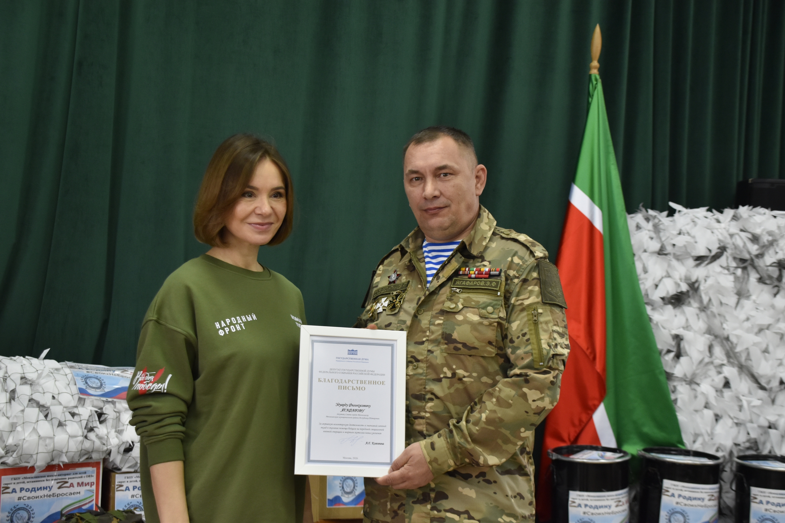 Альфия Когогина поблагодарила всех за помощь фронту и вручила от своего имени Благодарственное письмо Эдуарду Ягафарову, а от «Народного фронта» — Егору Юдину.