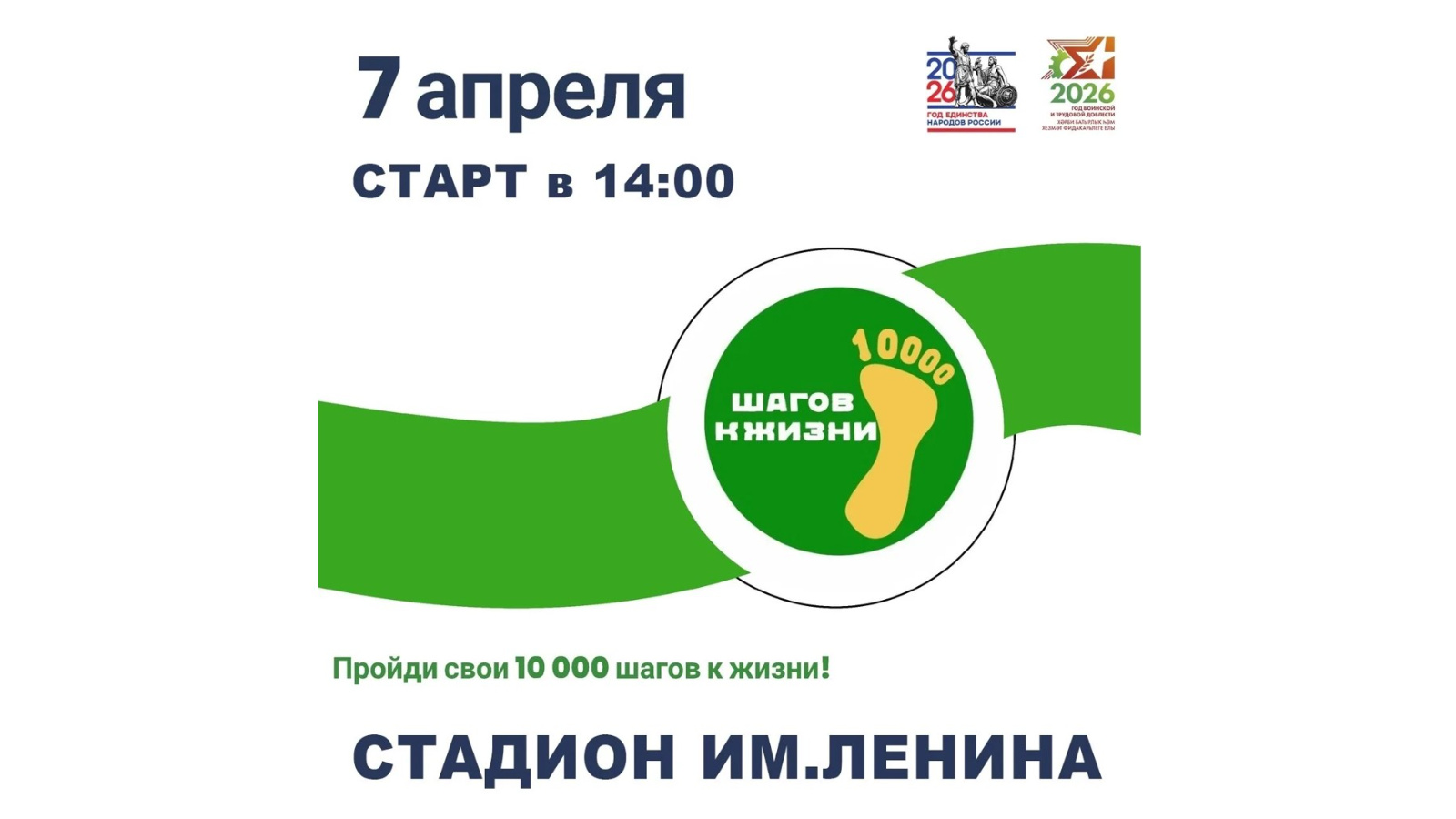 7 апреля на стадионе имени Ленина состоится массовая физкультурная акция «10000 шагов к жизни», приуроченная к ГОДУ ЕДИНСТВА НАРОДОВ РОССИИ и ГОДУ ВОИНСКОЙ И ТРУДОВОЙ ДОБЛЕСТИ. Начало мероприятия — в 14:00. Место: Стадион им.Ленина Сбор участников — за 15 минут до старта.