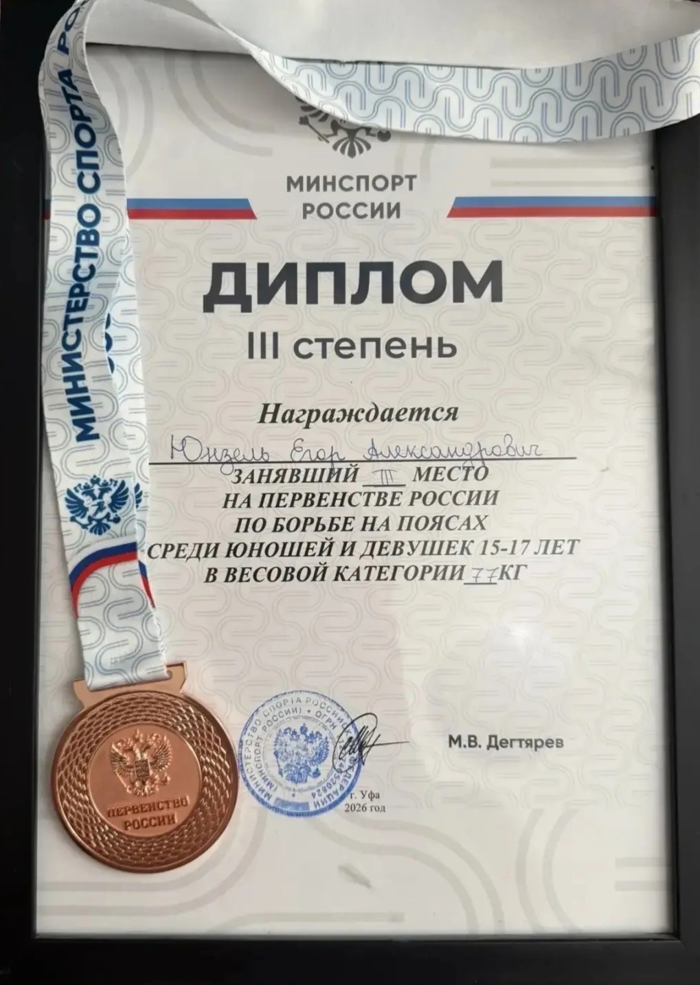 Юнзель Егор стал обладателем бронзы по борьбе на поясах среди юношей и девушек 15-17 лет в весовой категории 77кг.