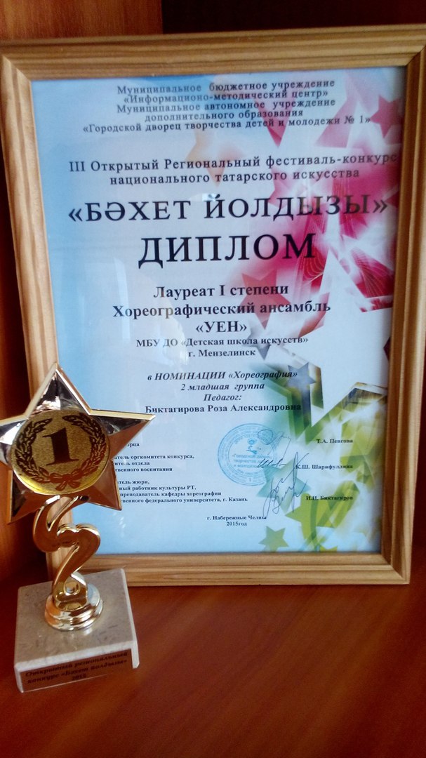 В городе Наб.Челны прошел III Открытый Республиканский фестиваль - конкурс национального татарского искусства «Бэхет йолдызы». Хореографический ансамбль «Уен» (руководитель Роза Биктагирова) стал Лауреатом I степени.