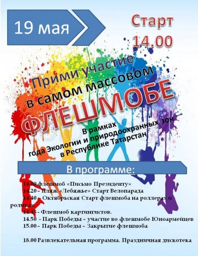 Мероприятие включает в себя флешмоб «Письмо президенту» на территории береговой зоны г.Мензелинска, велопарад, вручение благодарственных писем активной молодежи города, дискотека.