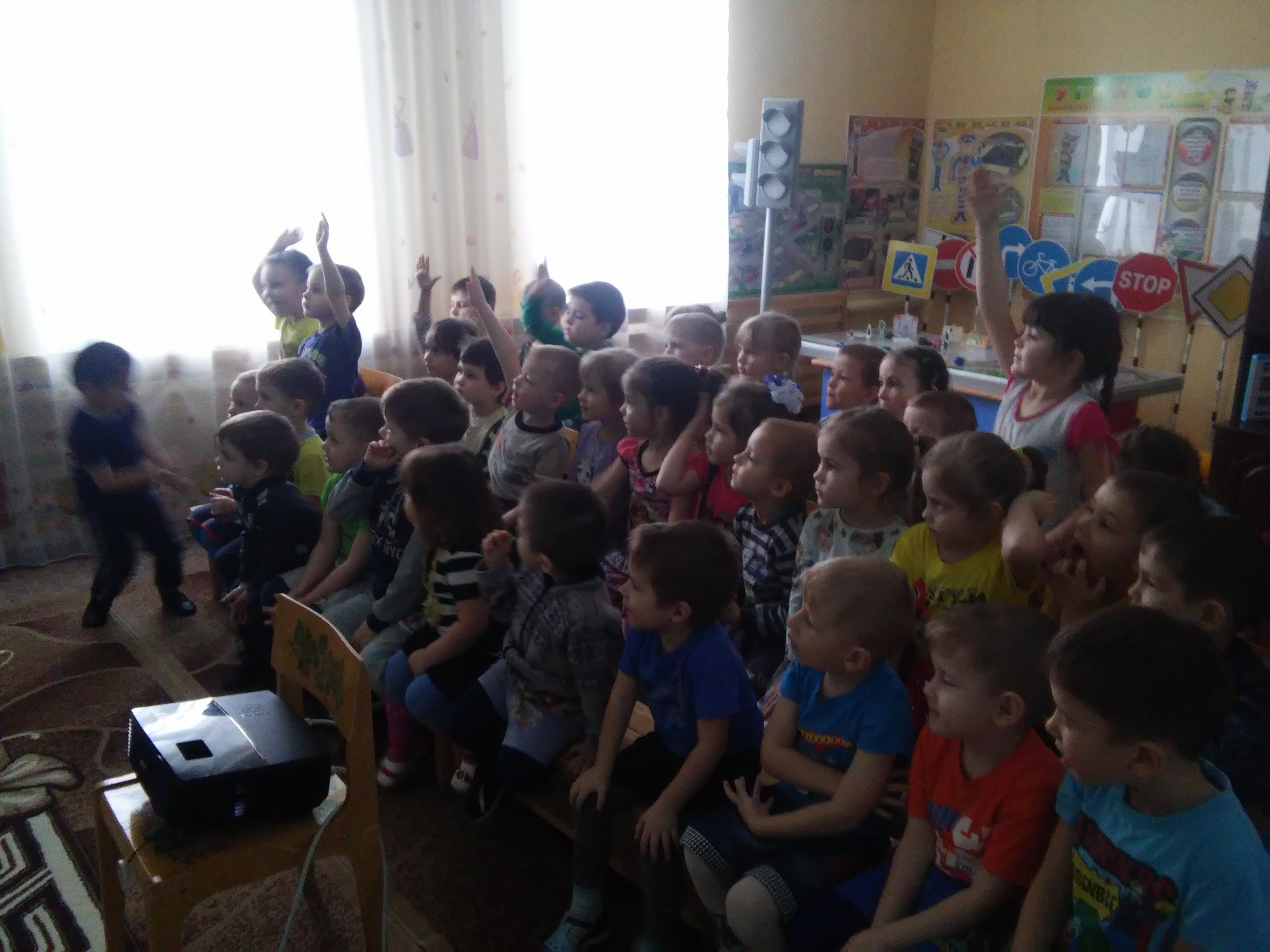 Дети с интересом просмотрели видеоролики направленные на предупреждение дорожного травматизма, мультфильмы по правилам дорожного движения, вспомнили дорожные знаки.